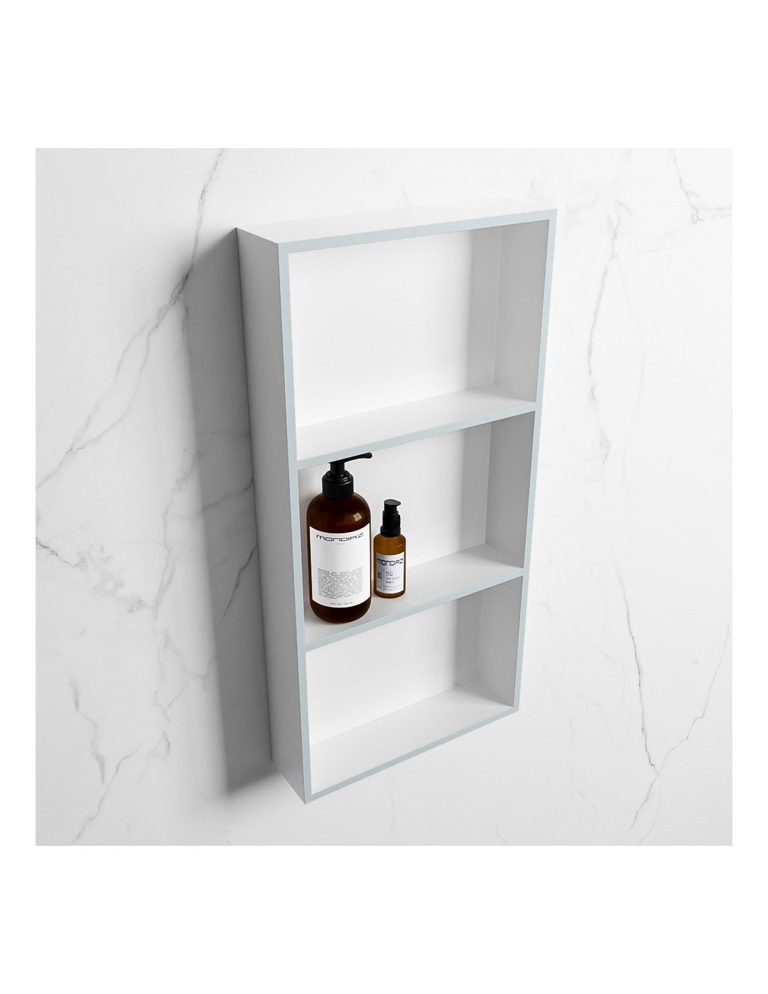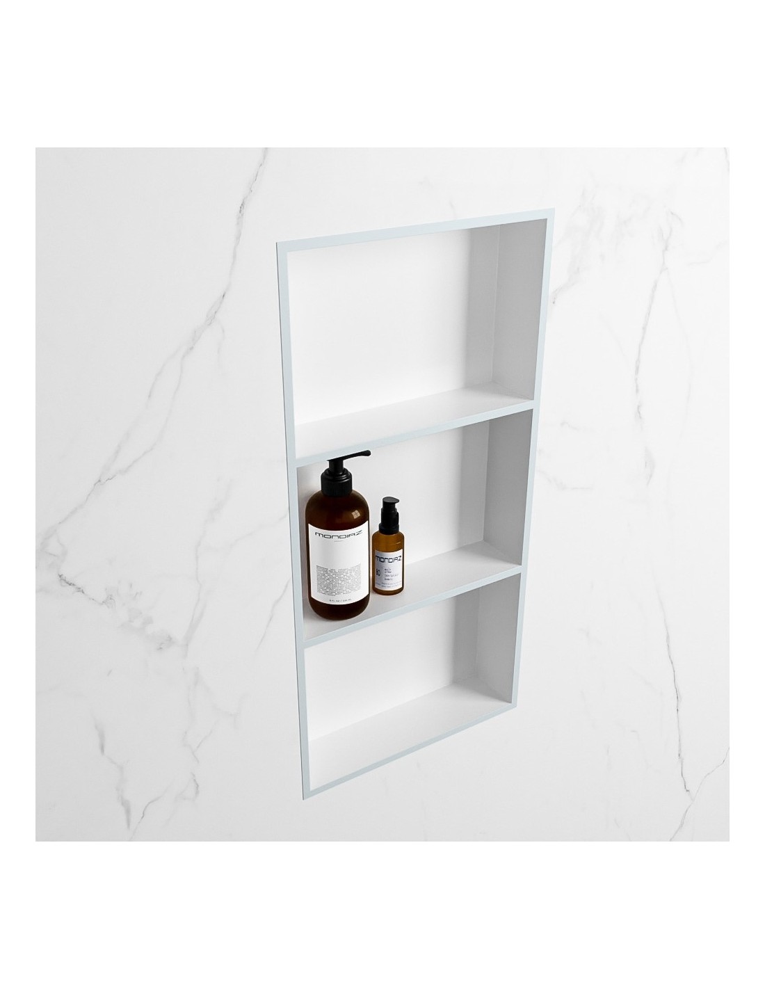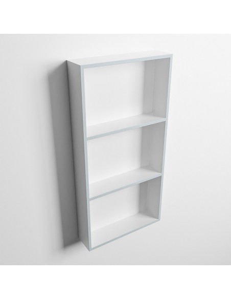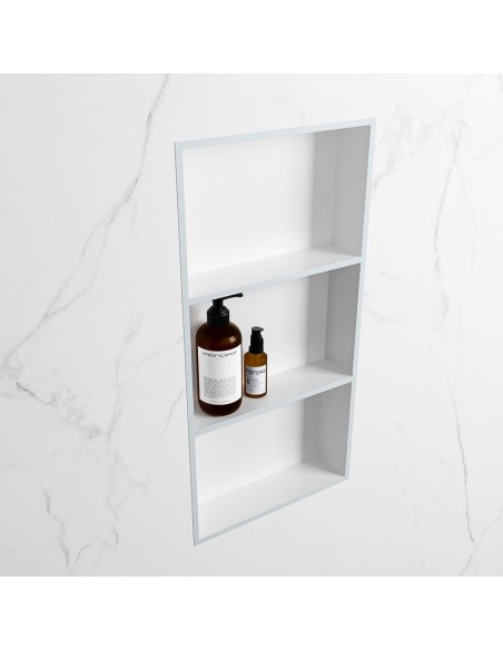 EASY hylde til badeværelset, udført i et moderne og stilrent design i det solide materiale "Solid Surface", der ikke alene giver badeværelset et stilrent design, men samtidig er lækkert at røre ved. Hylden kan enten monteres direkte på væggen, eller indbygges. Hylden måler 59,5 x 29,5 cm i højde og bredde (ydermål).