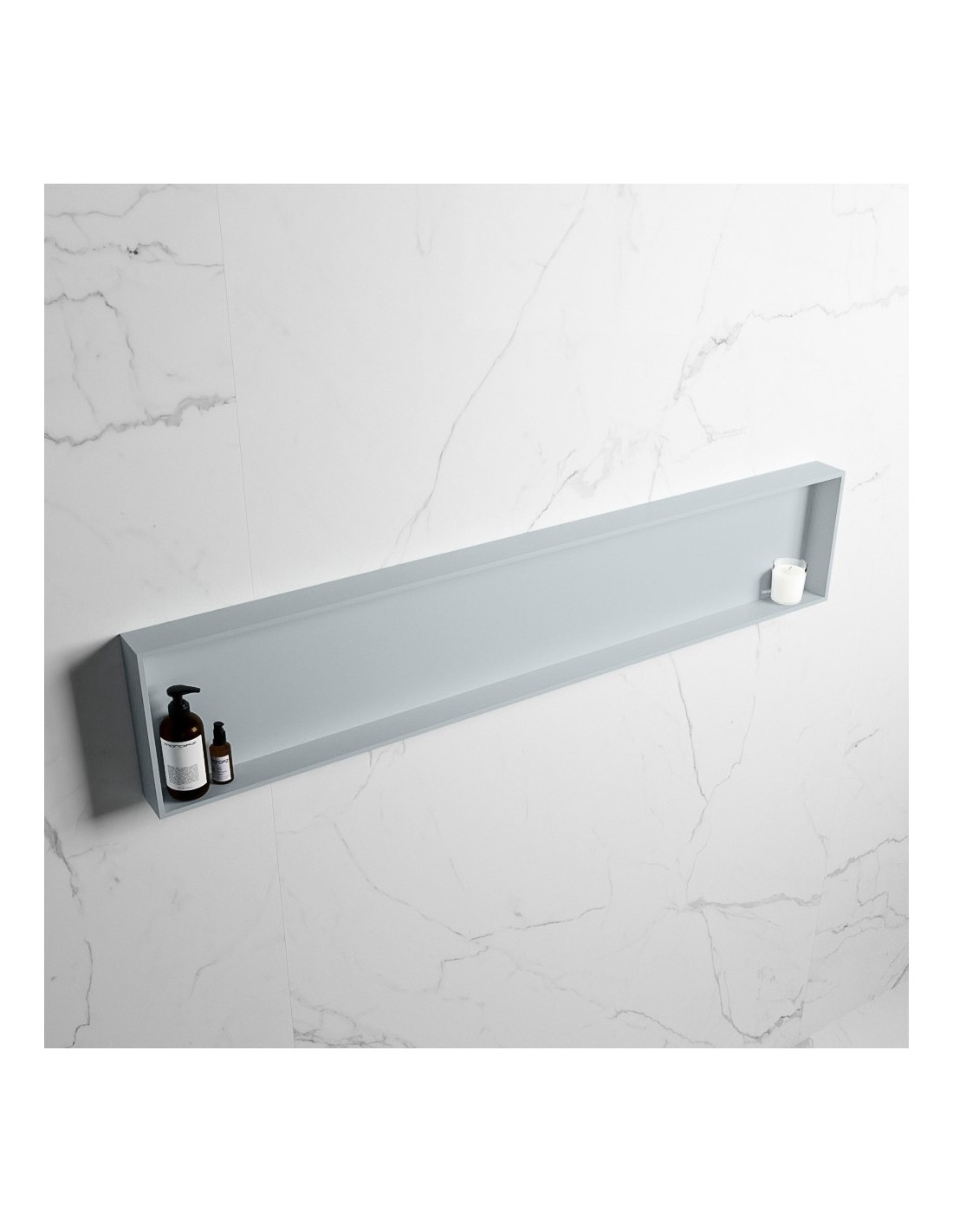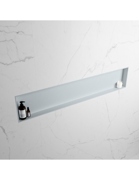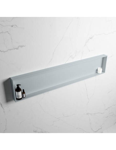 EASY hylde til badeværelset, udført i et moderne og stilrent design i det solide materiale "Solid Surface", der ikke alene giver badeværelset et stilrent design, men samtidig er lækkert at røre ved. Hylden kan enten monteres direkte på væggen, eller indbygges. Hylden måler 149,5 x 29,5 cm i højde og bredde (ydermål).