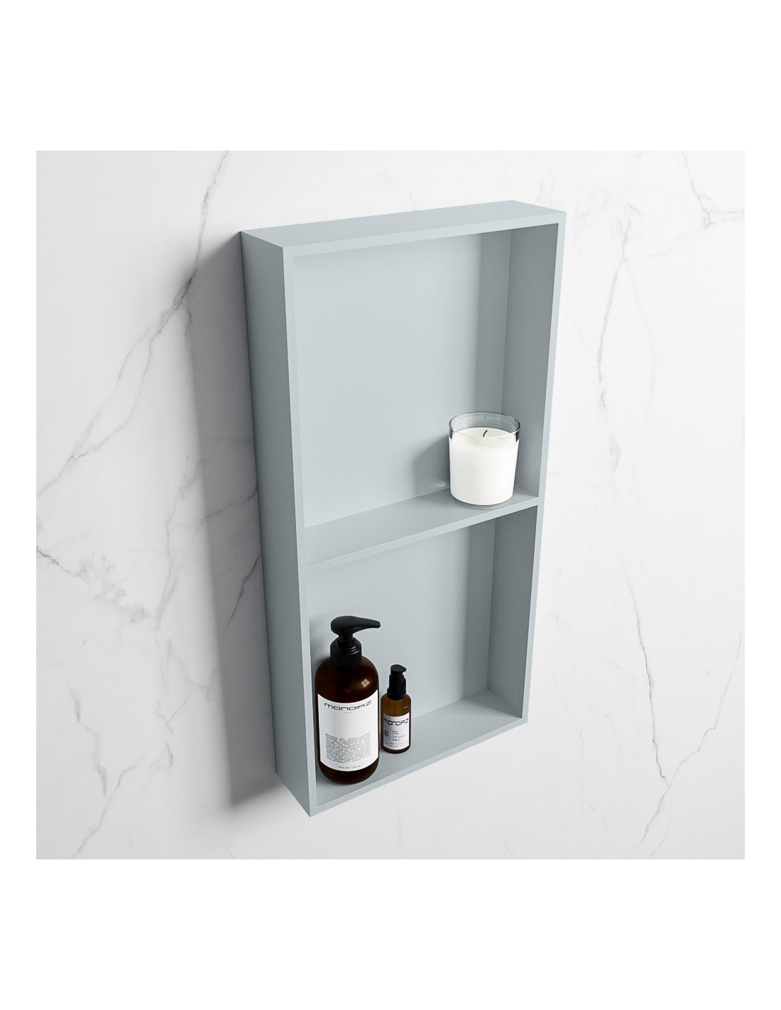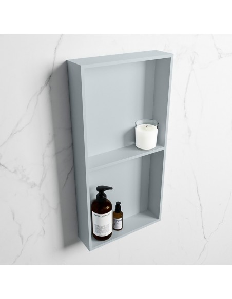 EASY hylde til badeværelset, udført i et moderne og stilrent design i det solide materiale "Solid Surface", der ikke alene giver badeværelset et stilrent design, men samtidig er lækkert at røre ved. Hylden kan enten monteres direkte på væggen, eller indbygges. Hylden måler 59,5 x 29,5 cm i højde og bredde (ydermål).