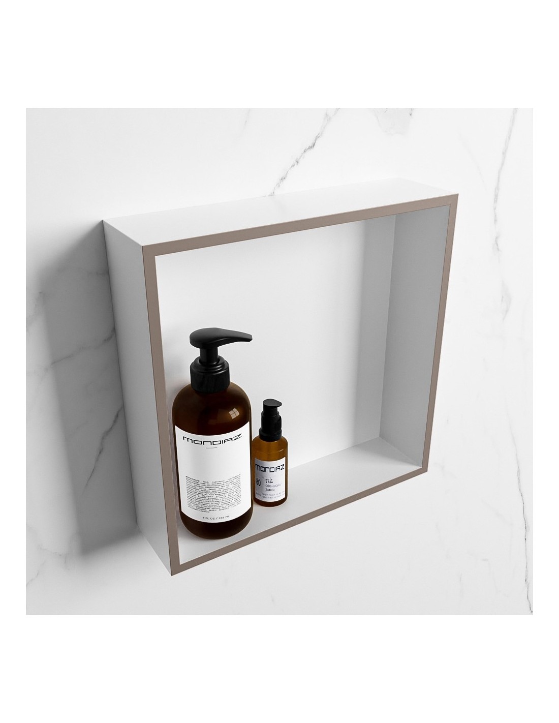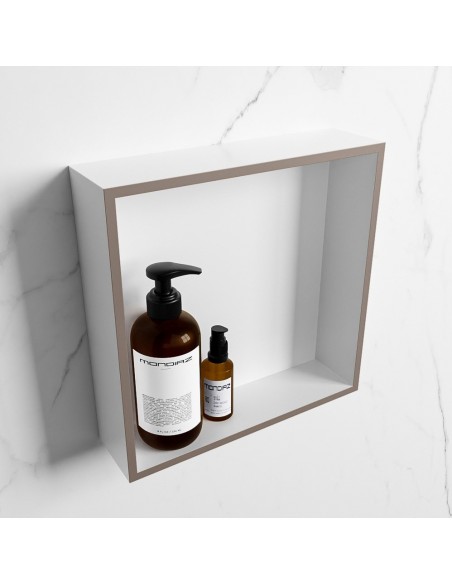 EASY hylde til badeværelset, udført i et moderne og stilrent design i det solide materiale "Solid Surface", der ikke alene giver badeværelset et stilrent design, men samtidig er lækkert at røre ved. Hylden kan enten monteres direkte på væggen, eller indbygges. Hylden måler 29,5 x 29,5 cm i højde og bredde (ydermål).