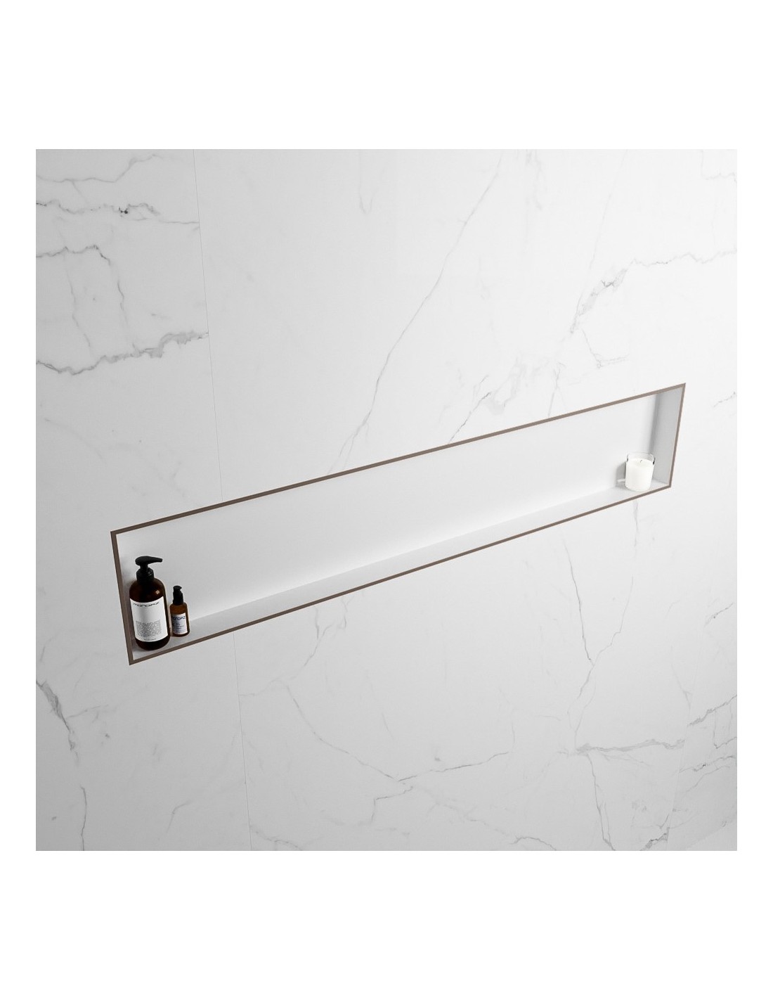 EASY hylde til badeværelset, udført i et moderne og stilrent design i det solide materiale "Solid Surface", der ikke alene giver badeværelset et stilrent design, men samtidig er lækkert at røre ved. Hylden kan enten monteres direkte på væggen, eller indbygges. Hylden måler 149,5 x 29,5 cm i højde og bredde (ydermål).