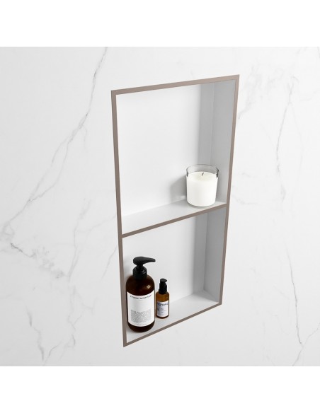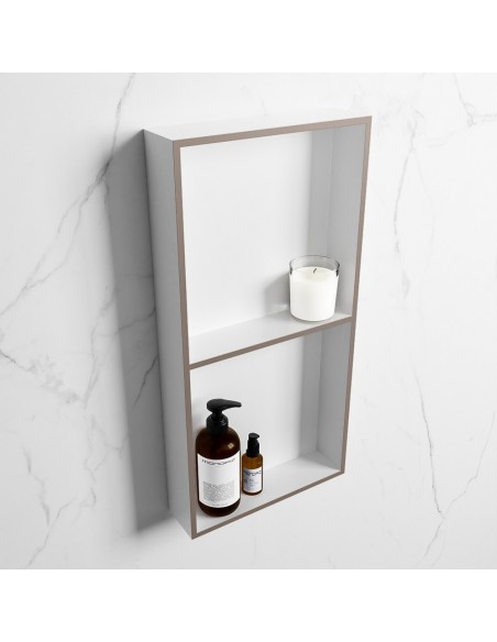 EASY hylde til badeværelset, udført i et moderne og stilrent design i det solide materiale "Solid Surface", der ikke alene giver badeværelset et stilrent design, men samtidig er lækkert at røre ved. Hylden kan enten monteres direkte på væggen, eller indbygges. Hylden måler 59,5 x 29,5 cm i højde og bredde (ydermål).
