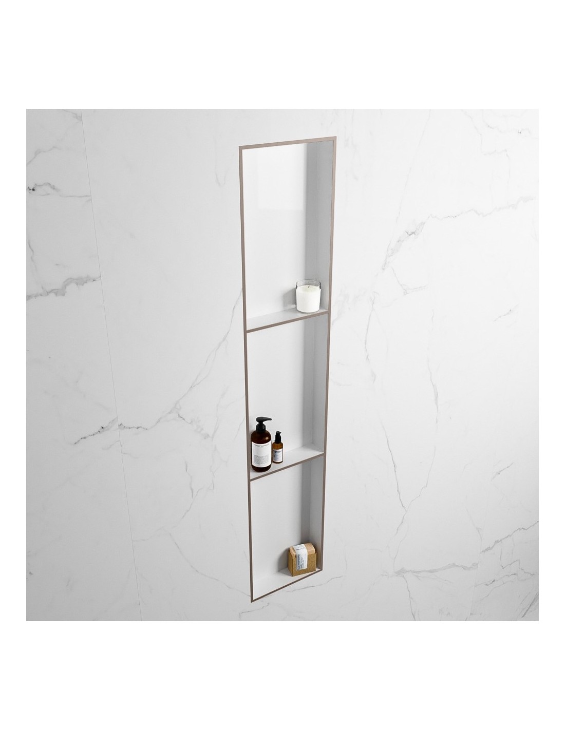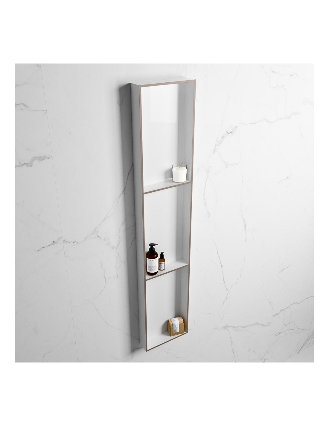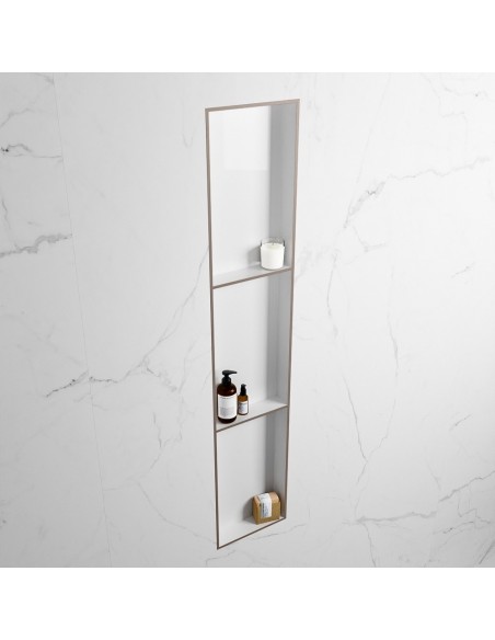 EASY hylde til badeværelset, udført i et moderne og stilrent design i det solide materiale "Solid Surface", der ikke alene giver badeværelset et stilrent design, men samtidig er lækkert at røre ved. Hylden kan enten monteres direkte på væggen, eller indbygges. Hylden måler 149,5 x 29,5 cm i højde og bredde (ydermål).