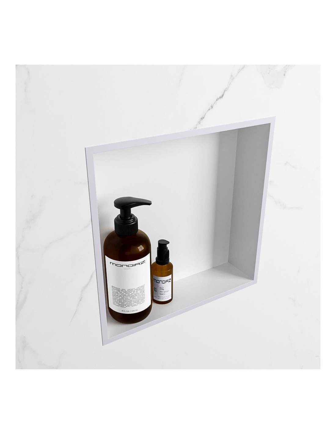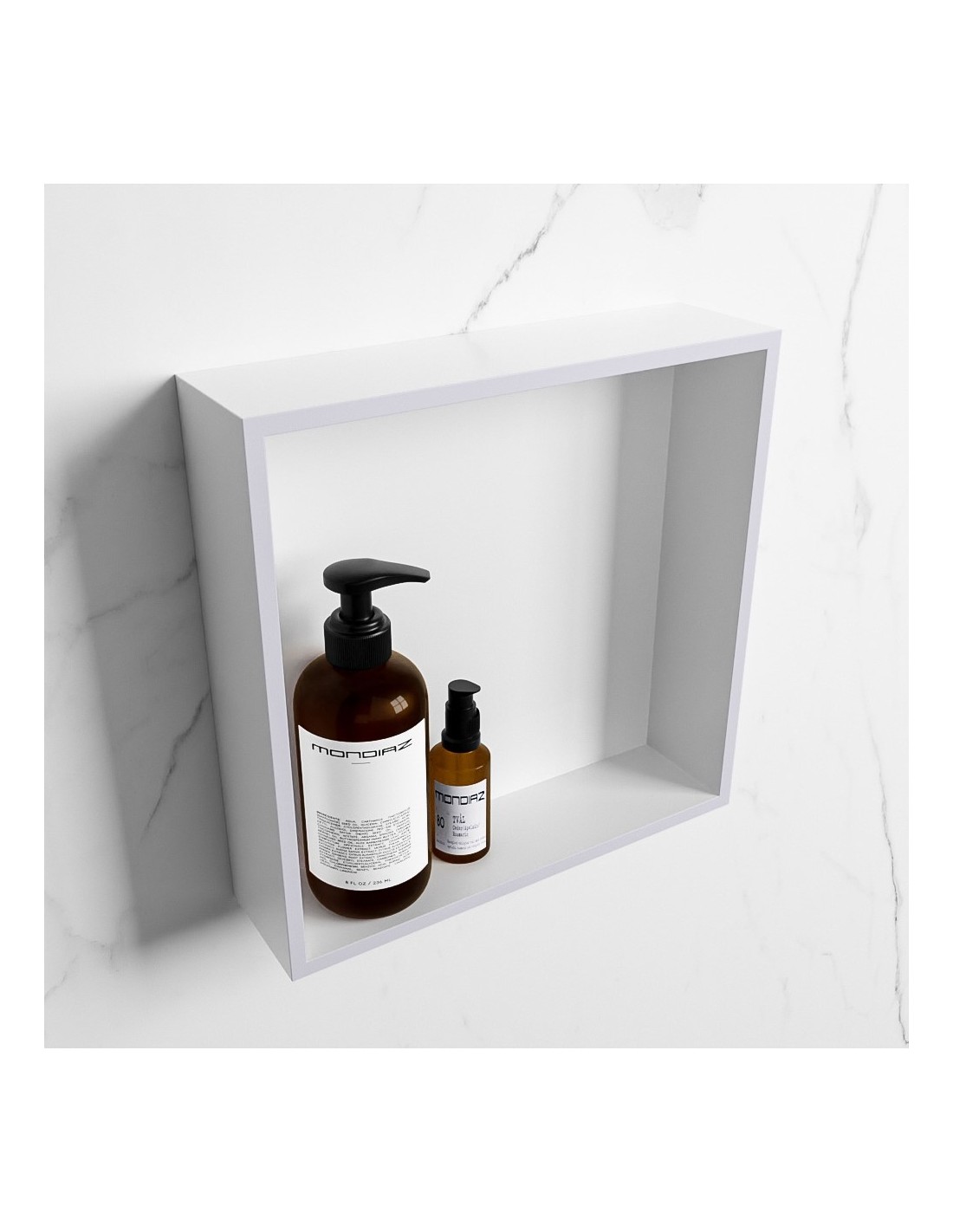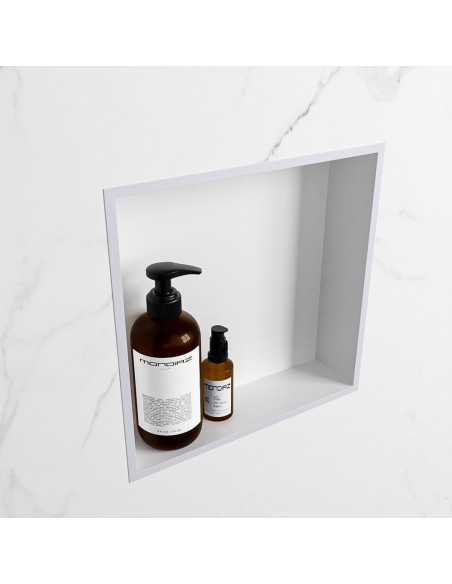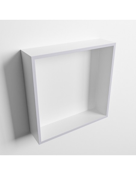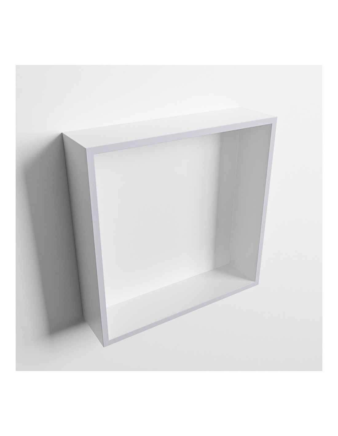 EASY hylde til badeværelset, udført i et moderne og stilrent design i det solide materiale "Solid Surface", der ikke alene giver badeværelset et stilrent design, men samtidig er lækkert at røre ved. Hylden kan enten monteres direkte på væggen, eller indbygges. Hylden måler 29,5 x 29,5 cm i højde og bredde (ydermål).