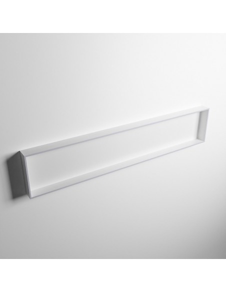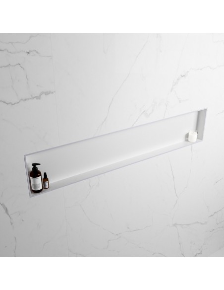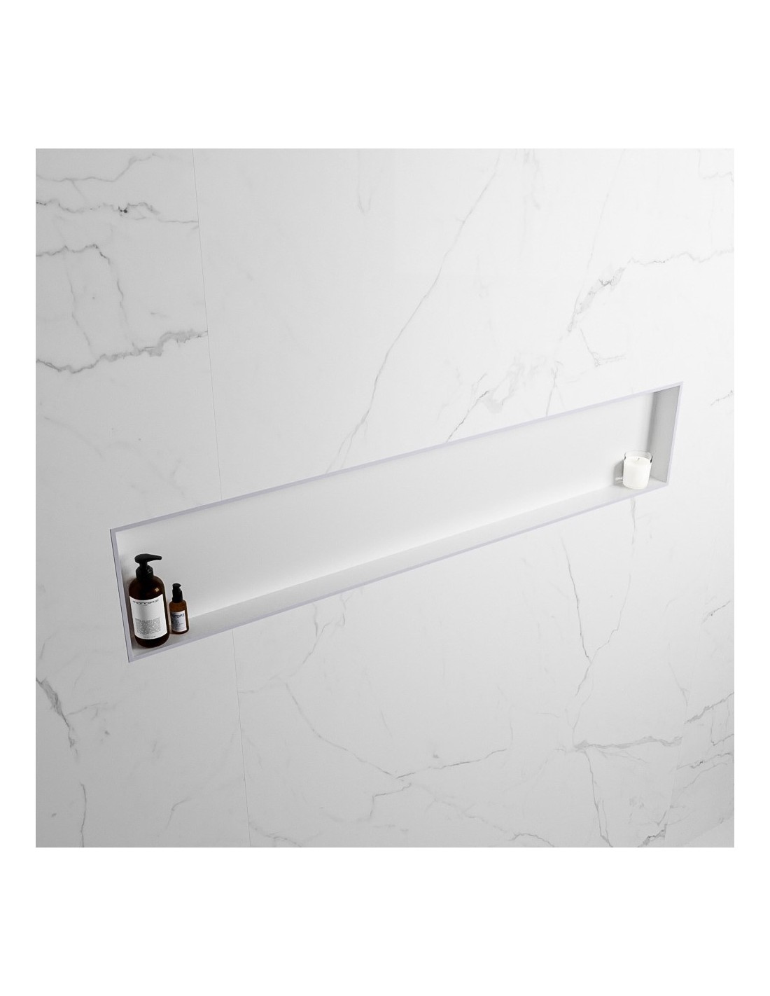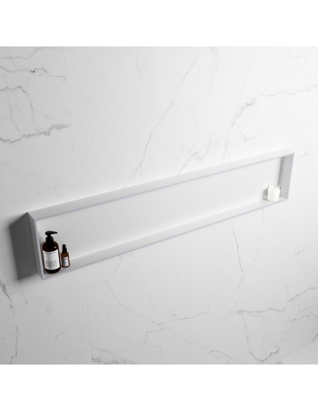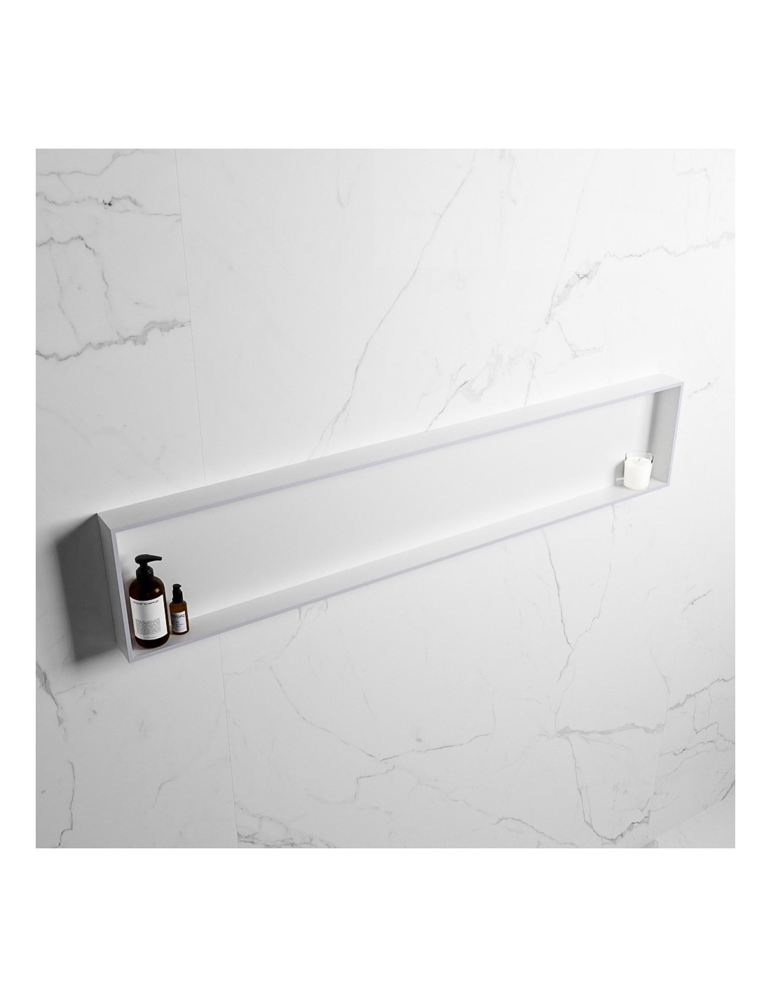 EASY hylde til badeværelset, udført i et moderne og stilrent design i det solide materiale "Solid Surface", der ikke alene giver badeværelset et stilrent design, men samtidig er lækkert at røre ved. Hylden kan enten monteres direkte på væggen, eller indbygges. Hylden måler 149,5 x 29,5 cm i højde og bredde (ydermål).