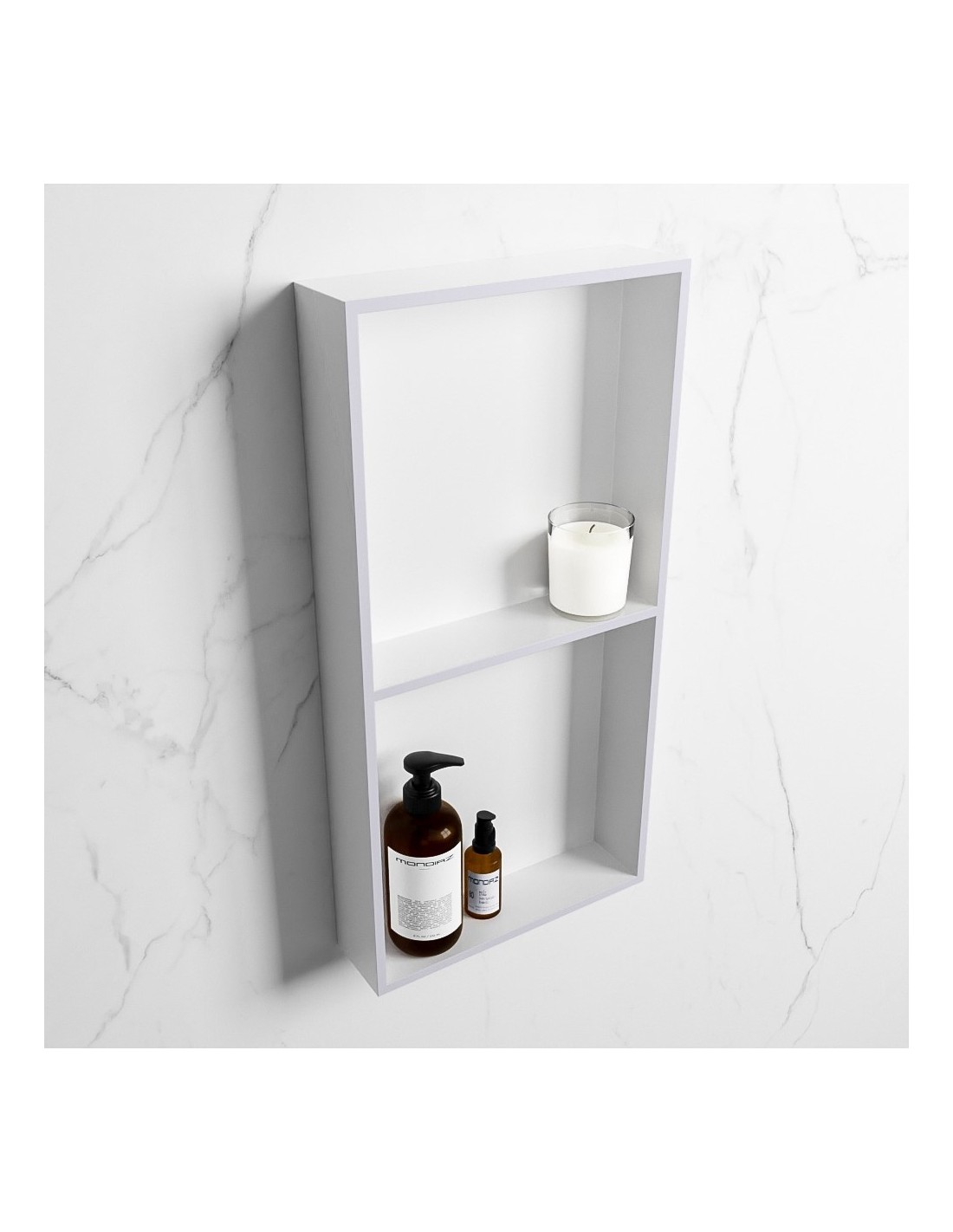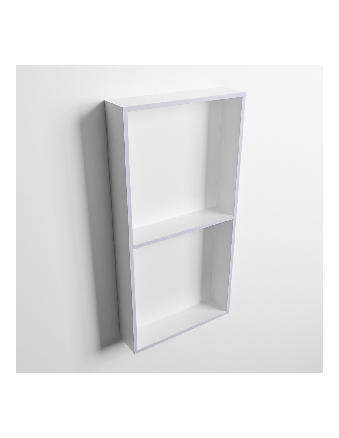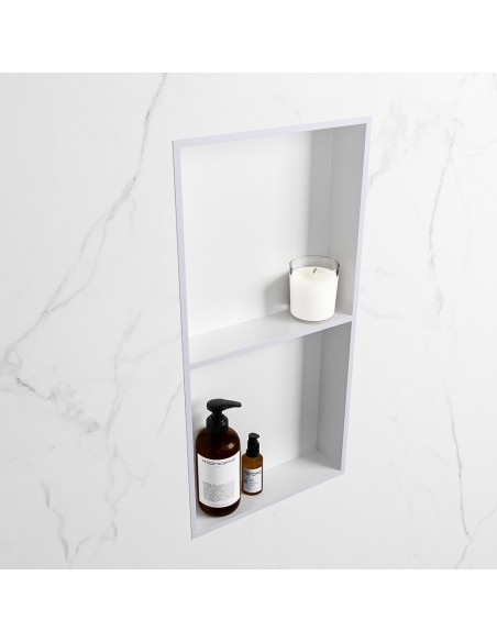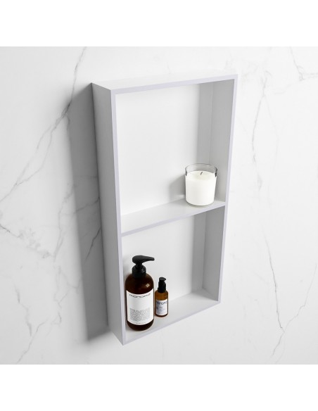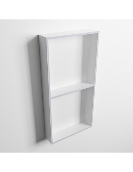 EASY hylde til badeværelset, udført i et moderne og stilrent design i det solide materiale "Solid Surface", der ikke alene giver badeværelset et stilrent design, men samtidig er lækkert at røre ved. Hylden kan enten monteres direkte på væggen, eller indbygges. Hylden måler 59,5 x 29,5 cm i højde og bredde (ydermål).