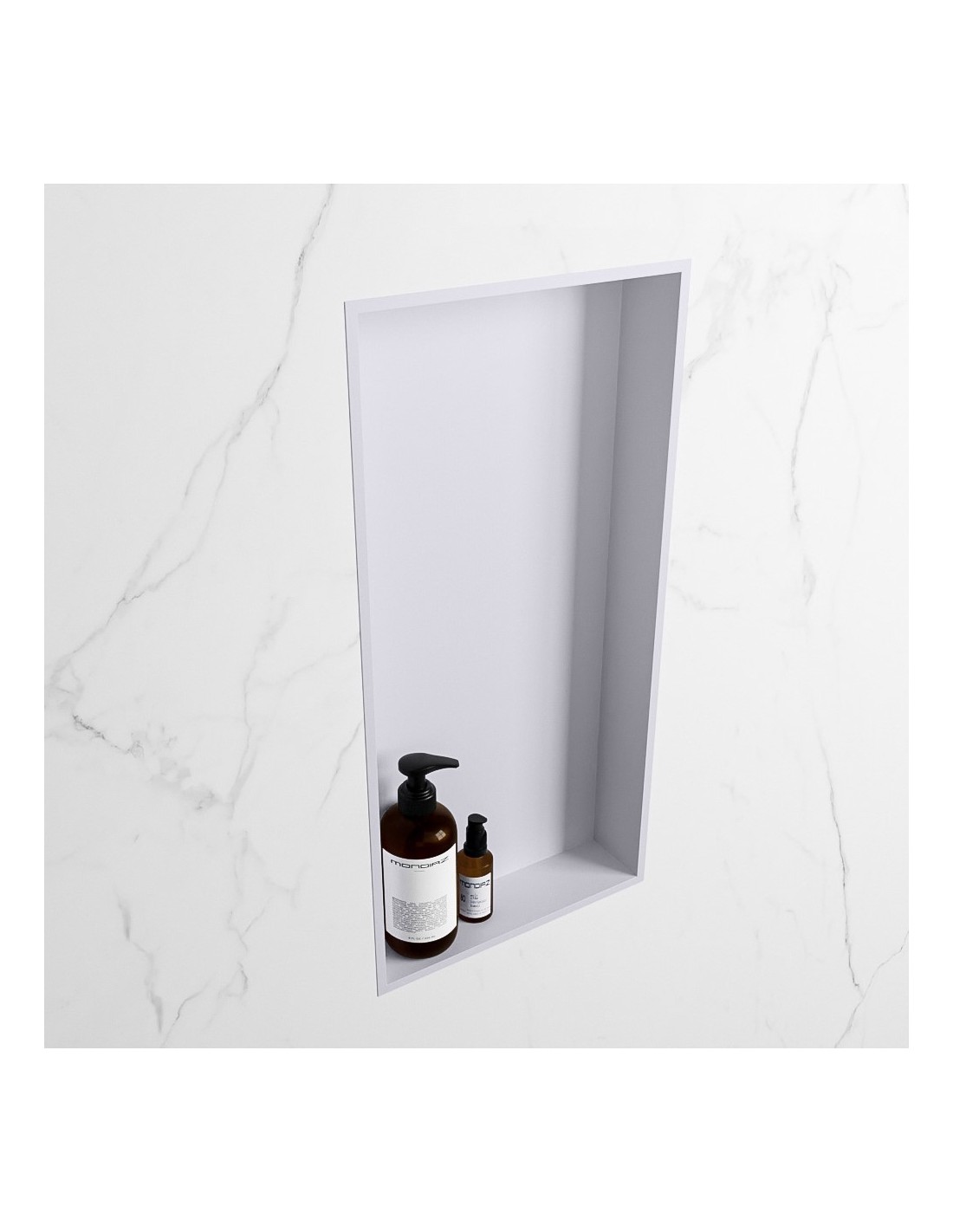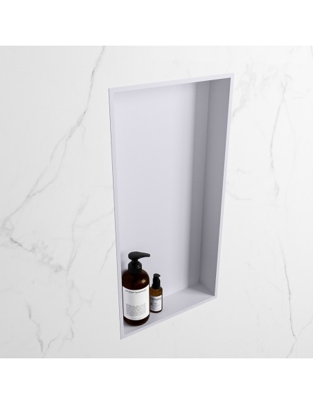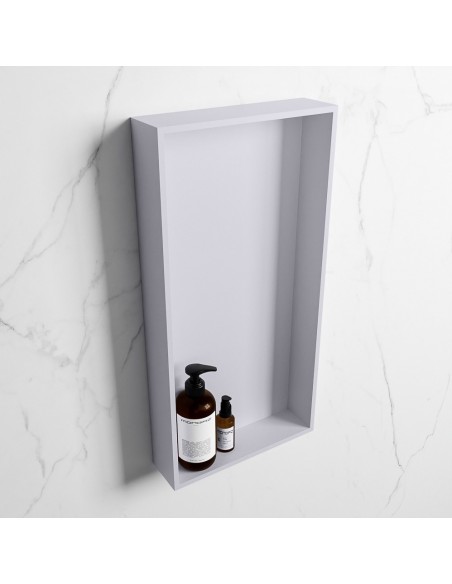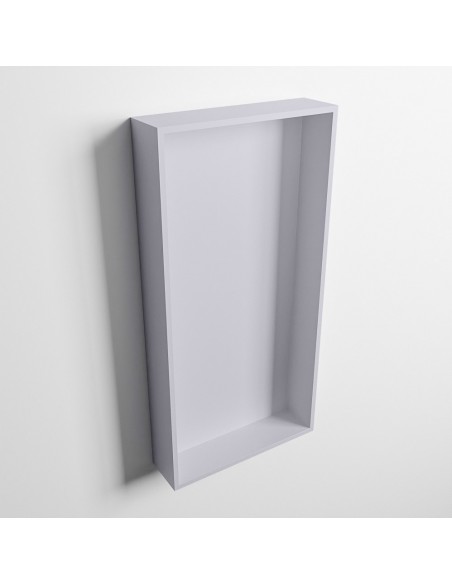 EASY hylde til badeværelset, udført i et moderne og stilrent design i det solide materiale "Solid Surface", der ikke alene giver badeværelset et stilrent design, men samtidig er lækkert at røre ved. Hylden kan enten monteres direkte på væggen, eller indbygges. Hylden måler 59,5 x 29,5 cm i højde og bredde (ydermål).