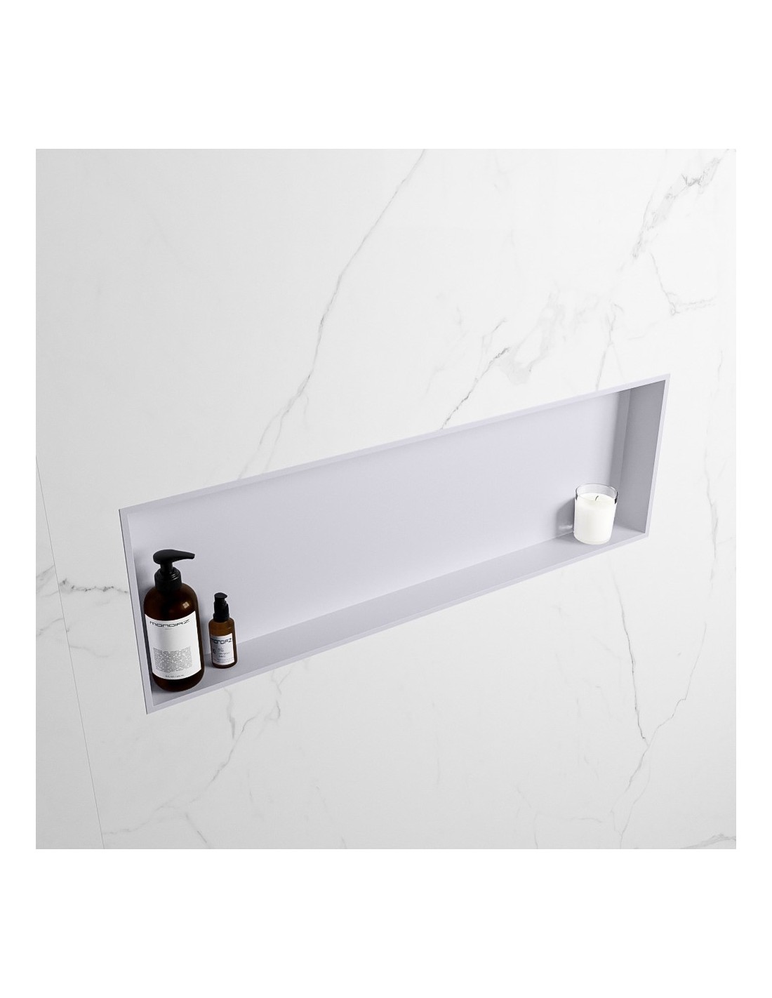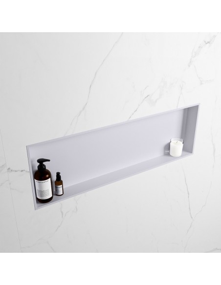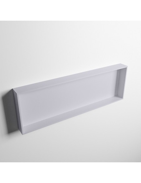 EASY hylde til badeværelset, udført i et moderne og stilrent design i det solide materiale "Solid Surface", der ikke alene giver badeværelset et stilrent design, men samtidig er lækkert at røre ved. Hylden kan enten monteres direkte på væggen, eller indbygges. Hylden måler 89,5 x 29,5 cm i højde og bredde (ydermål).