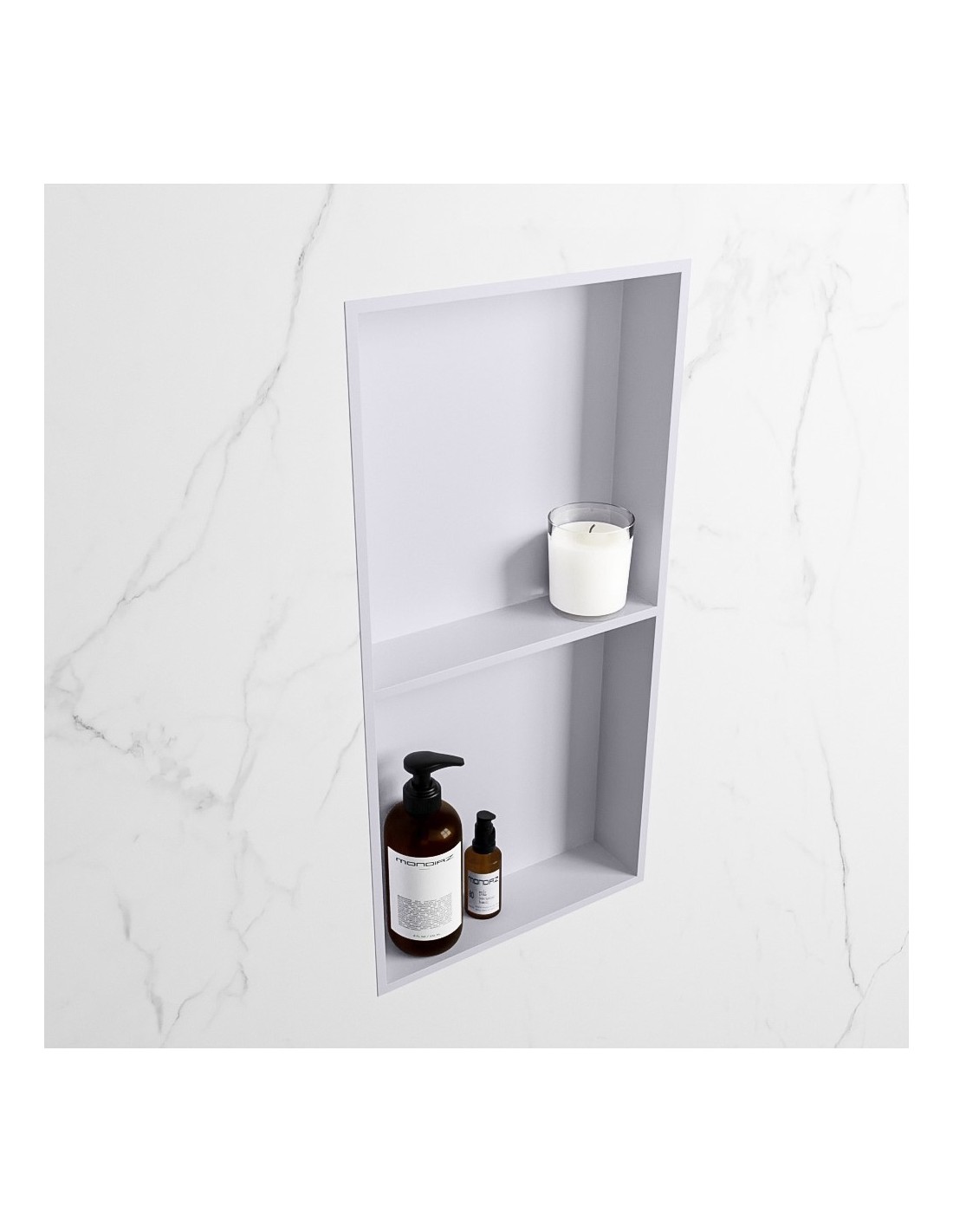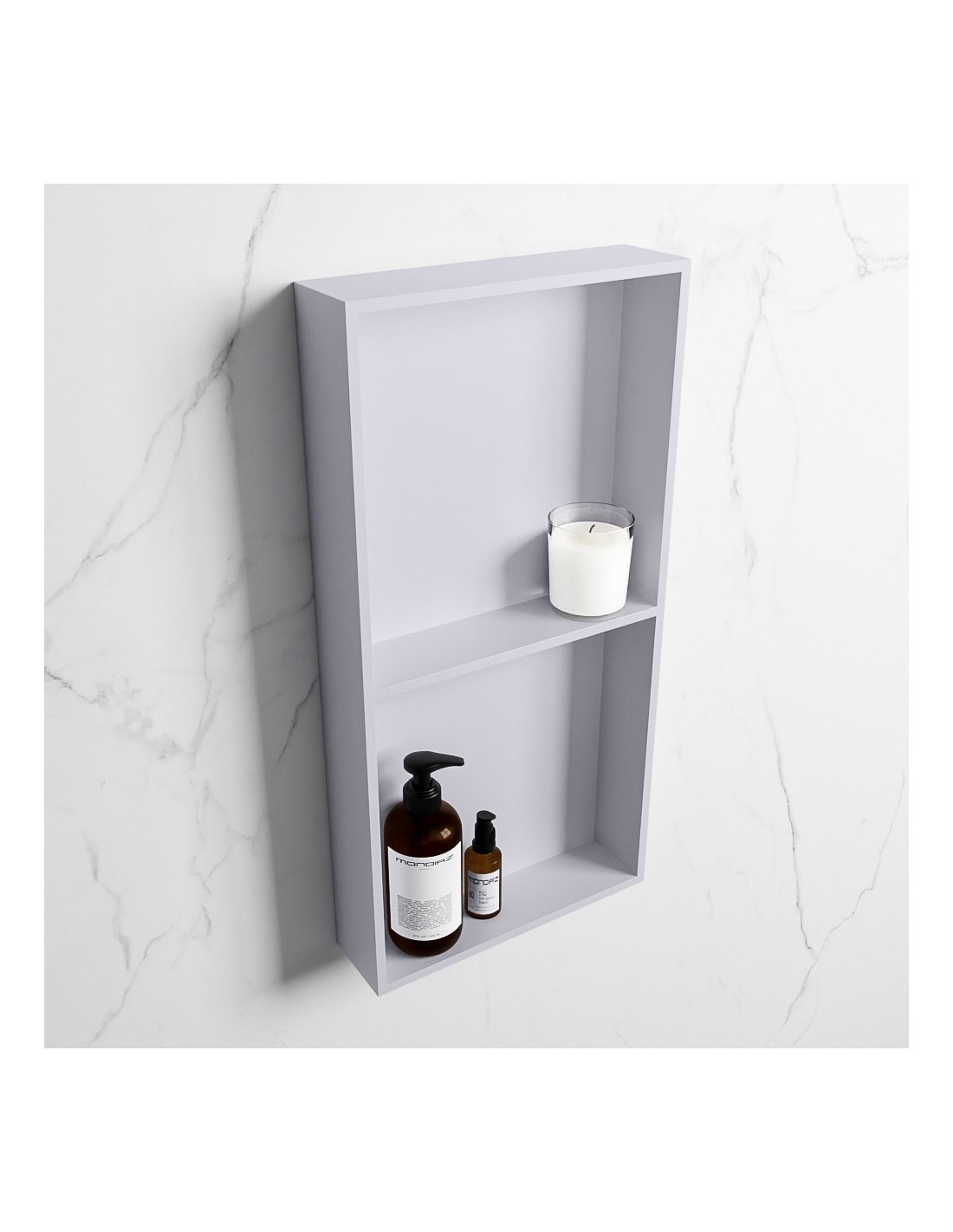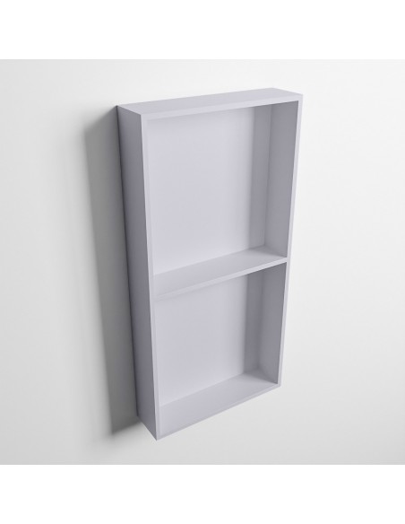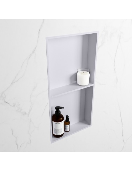 EASY hylde til badeværelset, udført i et moderne og stilrent design i det solide materiale "Solid Surface", der ikke alene giver badeværelset et stilrent design, men samtidig er lækkert at røre ved. Hylden kan enten monteres direkte på væggen, eller indbygges. Hylden måler 59,5 x 29,5 cm i højde og bredde (ydermål).