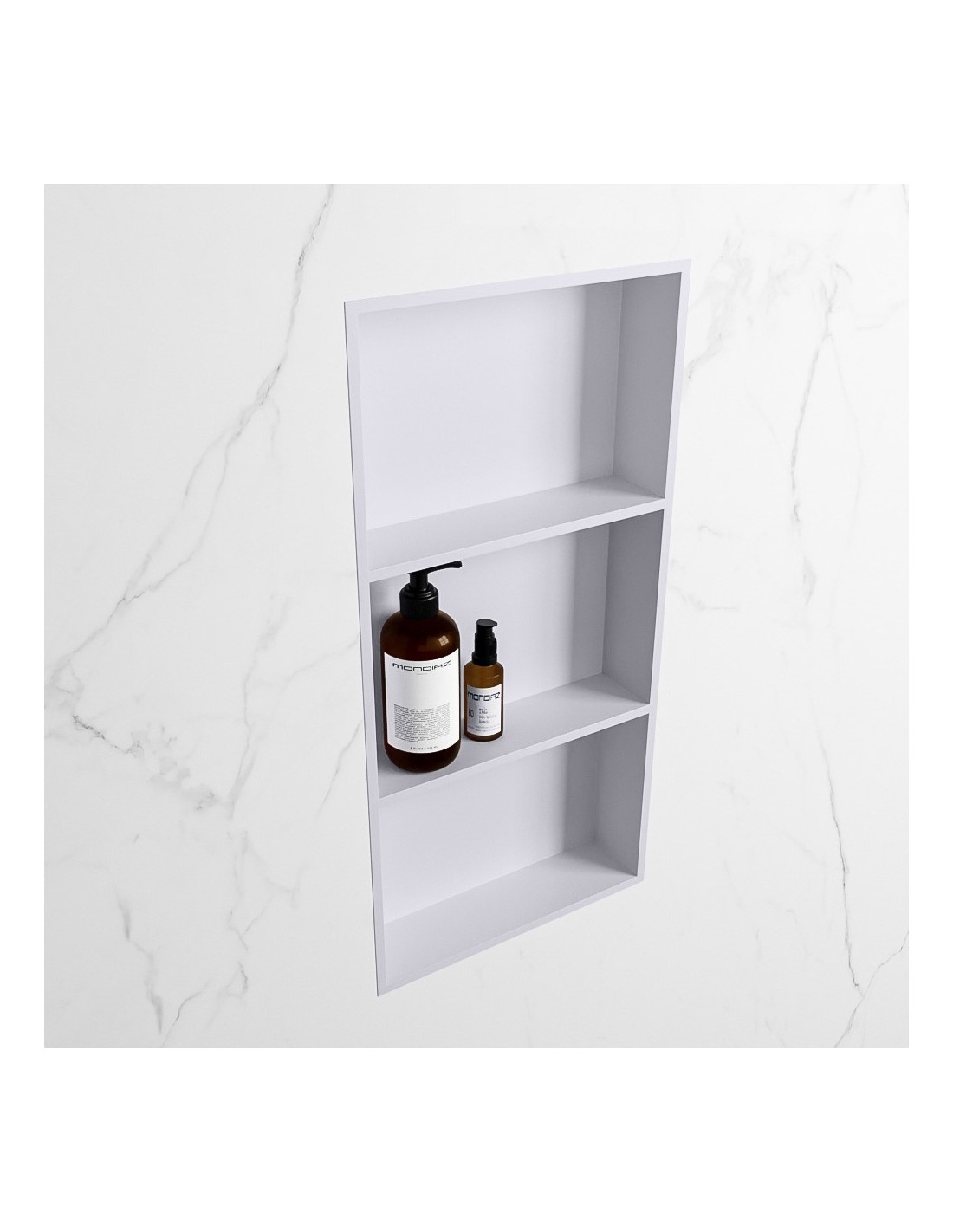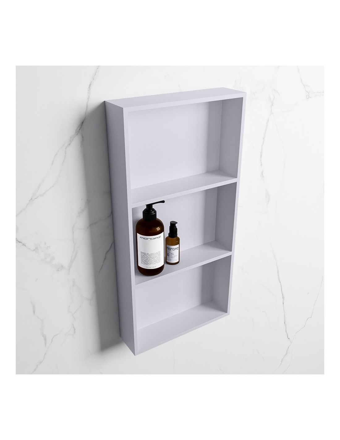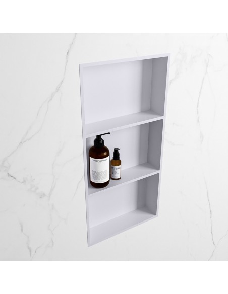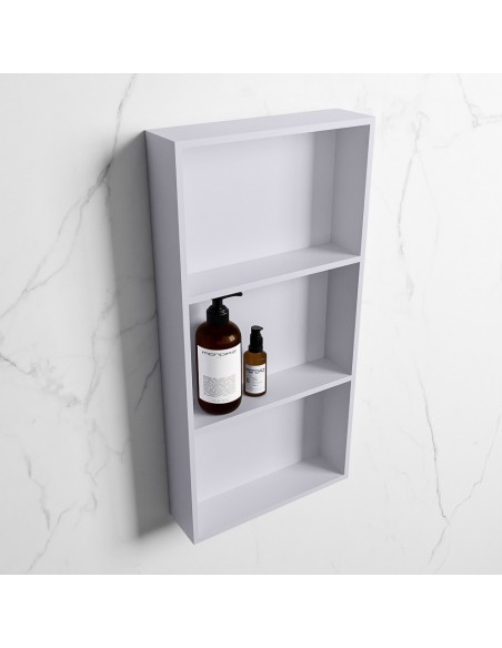 EASY hylde til badeværelset, udført i et moderne og stilrent design i det solide materiale "Solid Surface", der ikke alene giver badeværelset et stilrent design, men samtidig er lækkert at røre ved. Hylden kan enten monteres direkte på væggen, eller indbygges. Hylden måler 59,5 x 29,5 cm i højde og bredde (ydermål).