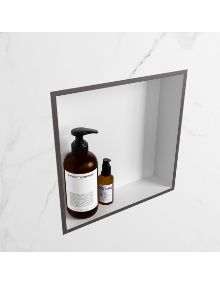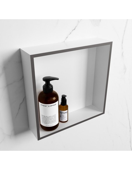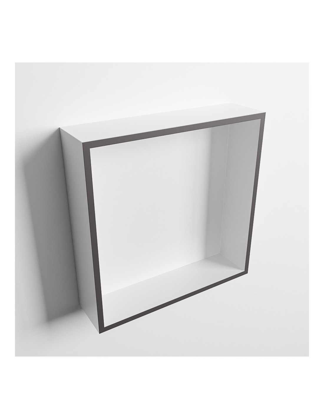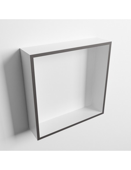 EASY hylde til badeværelset, udført i et moderne og stilrent design i det solide materiale "Solid Surface", der ikke alene giver badeværelset et stilrent design, men samtidig er lækkert at røre ved. Hylden kan enten monteres direkte på væggen, eller indbygges. Hylden måler 29,5 x 29,5 cm i højde og bredde (ydermål).