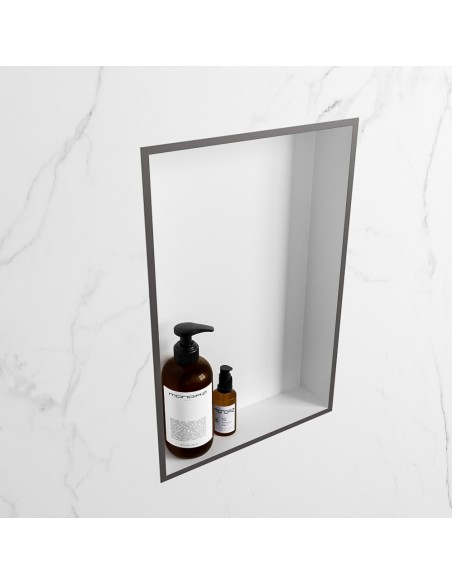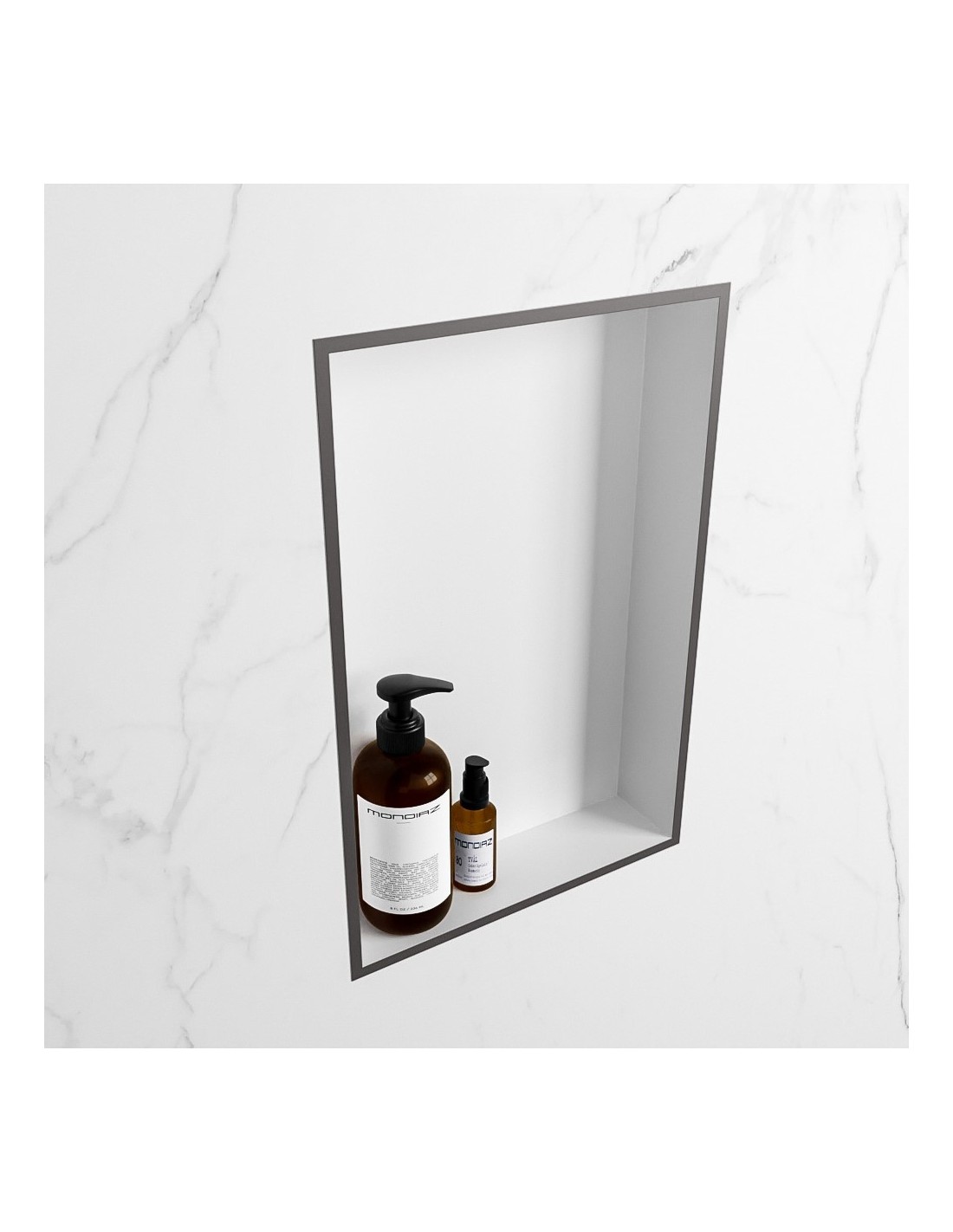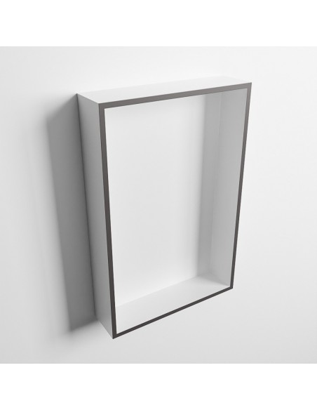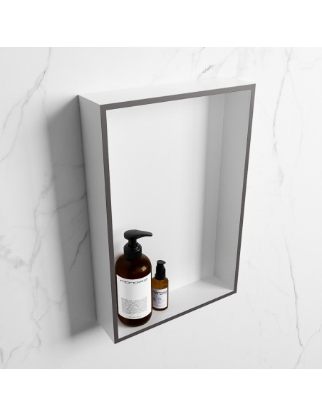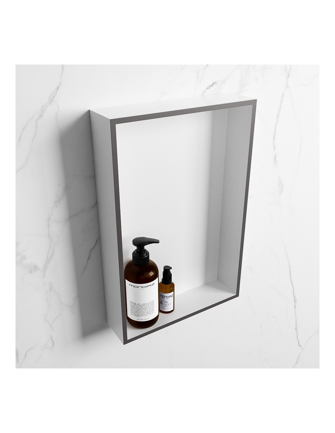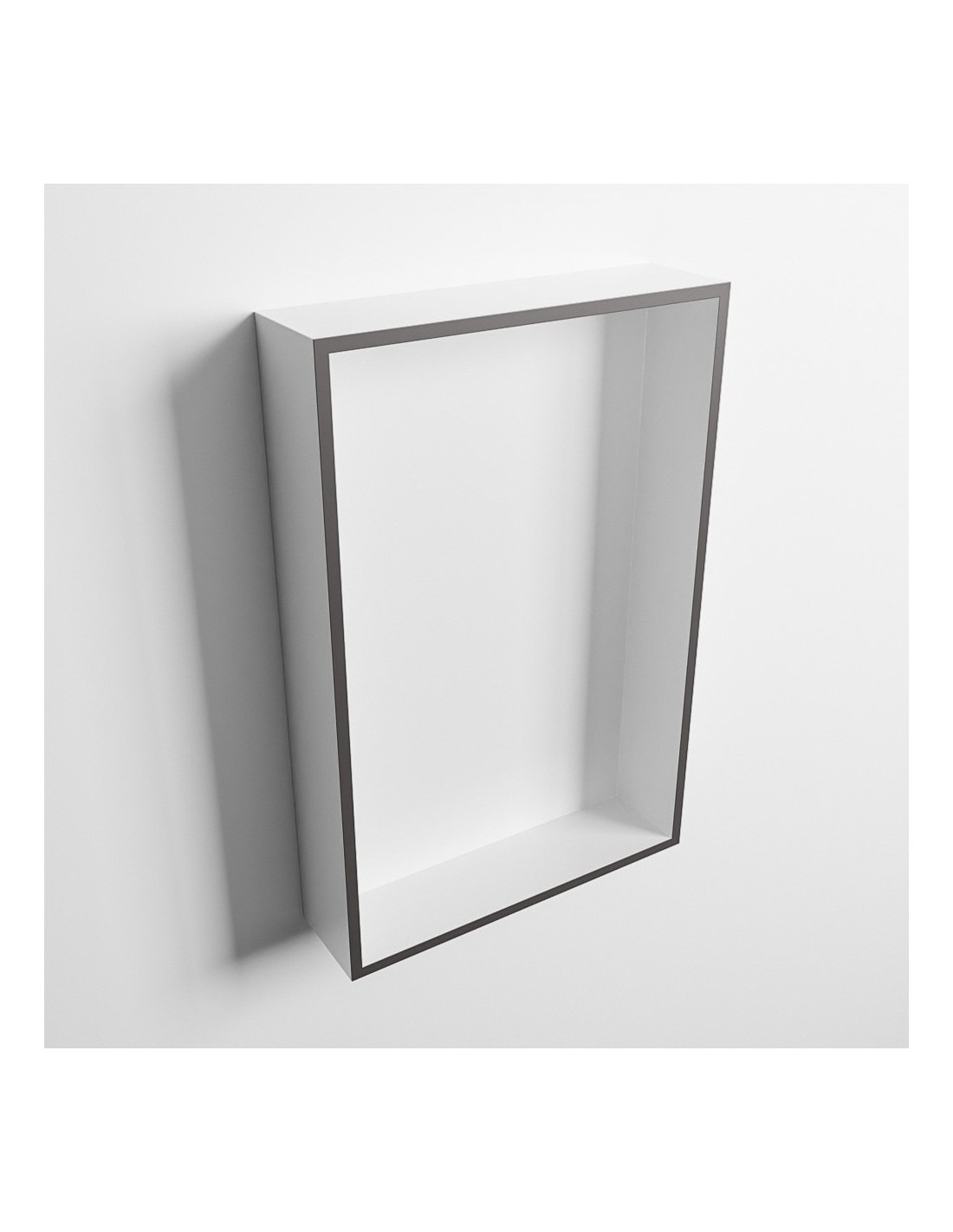 EASY hylde til badeværelset, udført i et moderne og stilrent design i det solide materiale "Solid Surface", der ikke alene giver badeværelset et stilrent design, men samtidig er lækkert at røre ved. Hylden kan enten monteres direkte på væggen, eller indbygges. Hylden måler 44,5 x 29,5 cm i højde og bredde (ydermål).