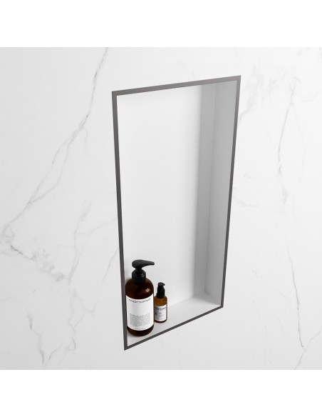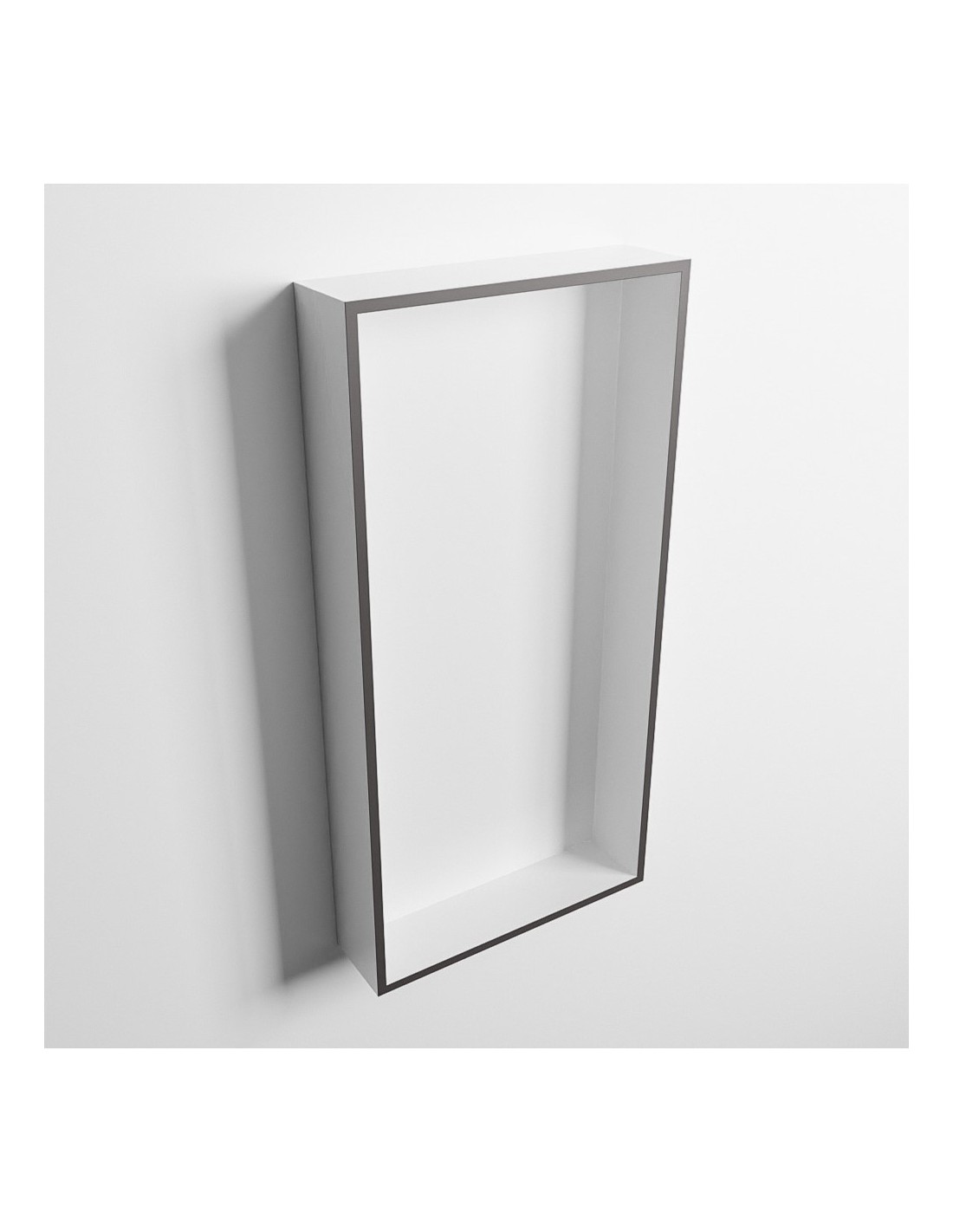 EASY hylde til badeværelset, udført i et moderne og stilrent design i det solide materiale "Solid Surface", der ikke alene giver badeværelset et stilrent design, men samtidig er lækkert at røre ved. Hylden kan enten monteres direkte på væggen, eller indbygges. Hylden måler 59,5 x 29,5 cm i højde og bredde (ydermål).