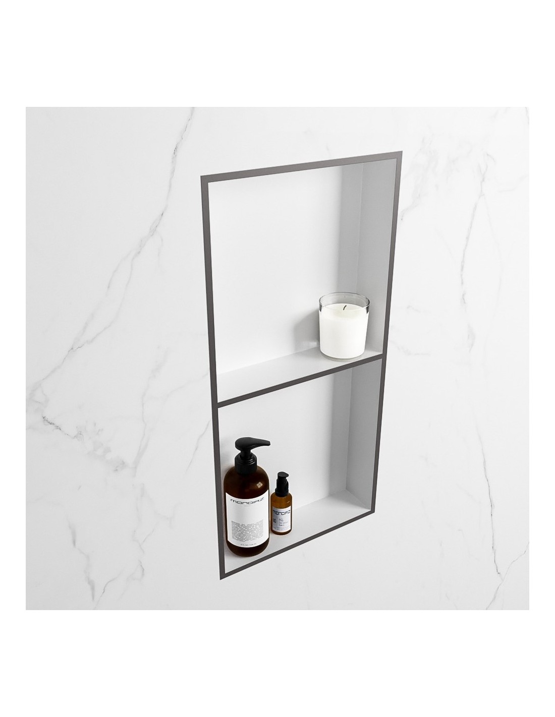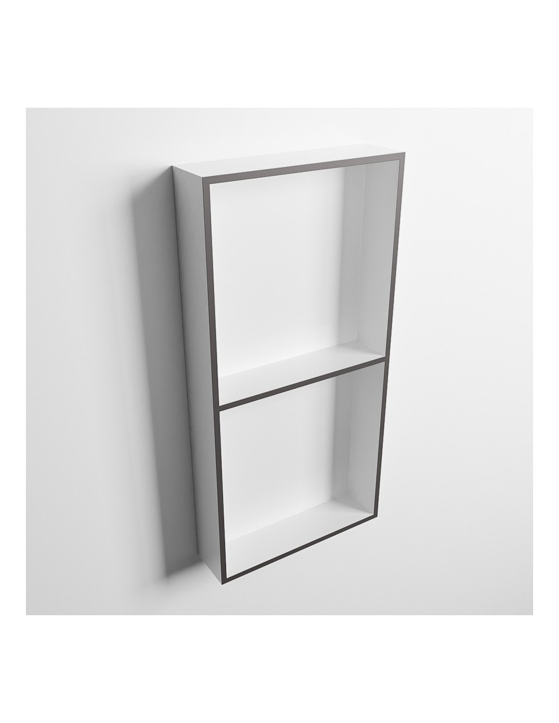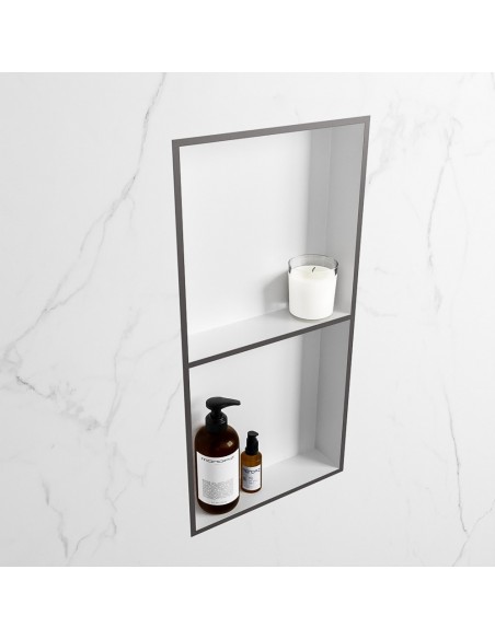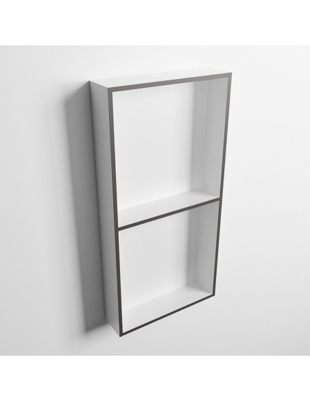EASY hylde til badeværelset, udført i et moderne og stilrent design i det solide materiale "Solid Surface", der ikke alene giver badeværelset et stilrent design, men samtidig er lækkert at røre ved. Hylden kan enten monteres direkte på væggen, eller indbygges. Hylden måler 59,5 x 29,5 cm i højde og bredde (ydermål).