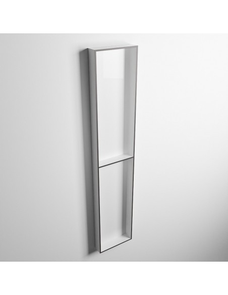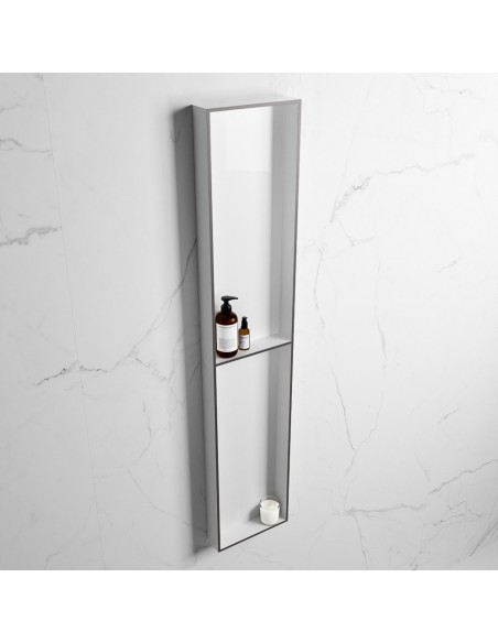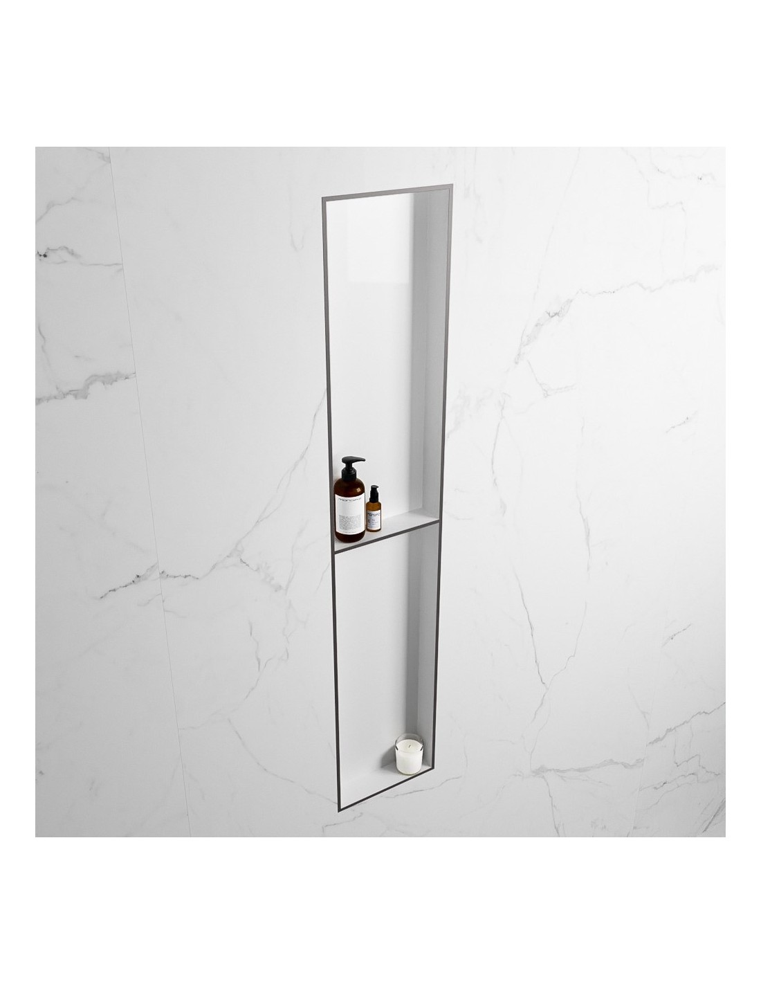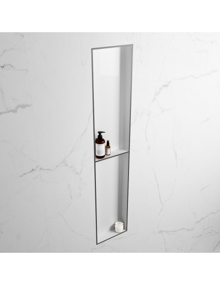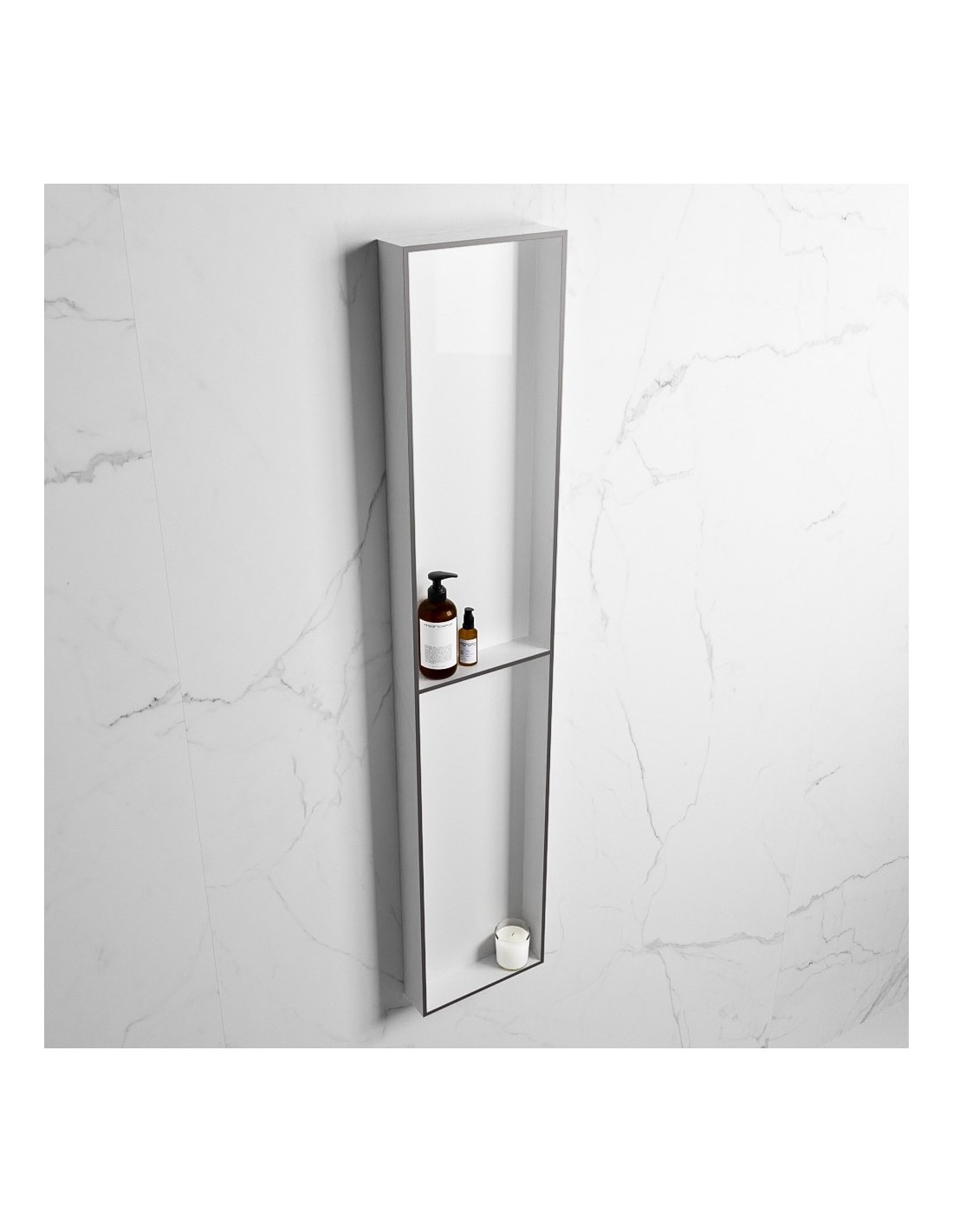 EASY hylde til badeværelset, udført i et moderne og stilrent design i det solide materiale "Solid Surface", der ikke alene giver badeværelset et stilrent design, men samtidig er lækkert at røre ved. Hylden kan enten monteres direkte på væggen, eller indbygges. Hylden måler 149,5 x 29,5 cm i højde og bredde (ydermål).