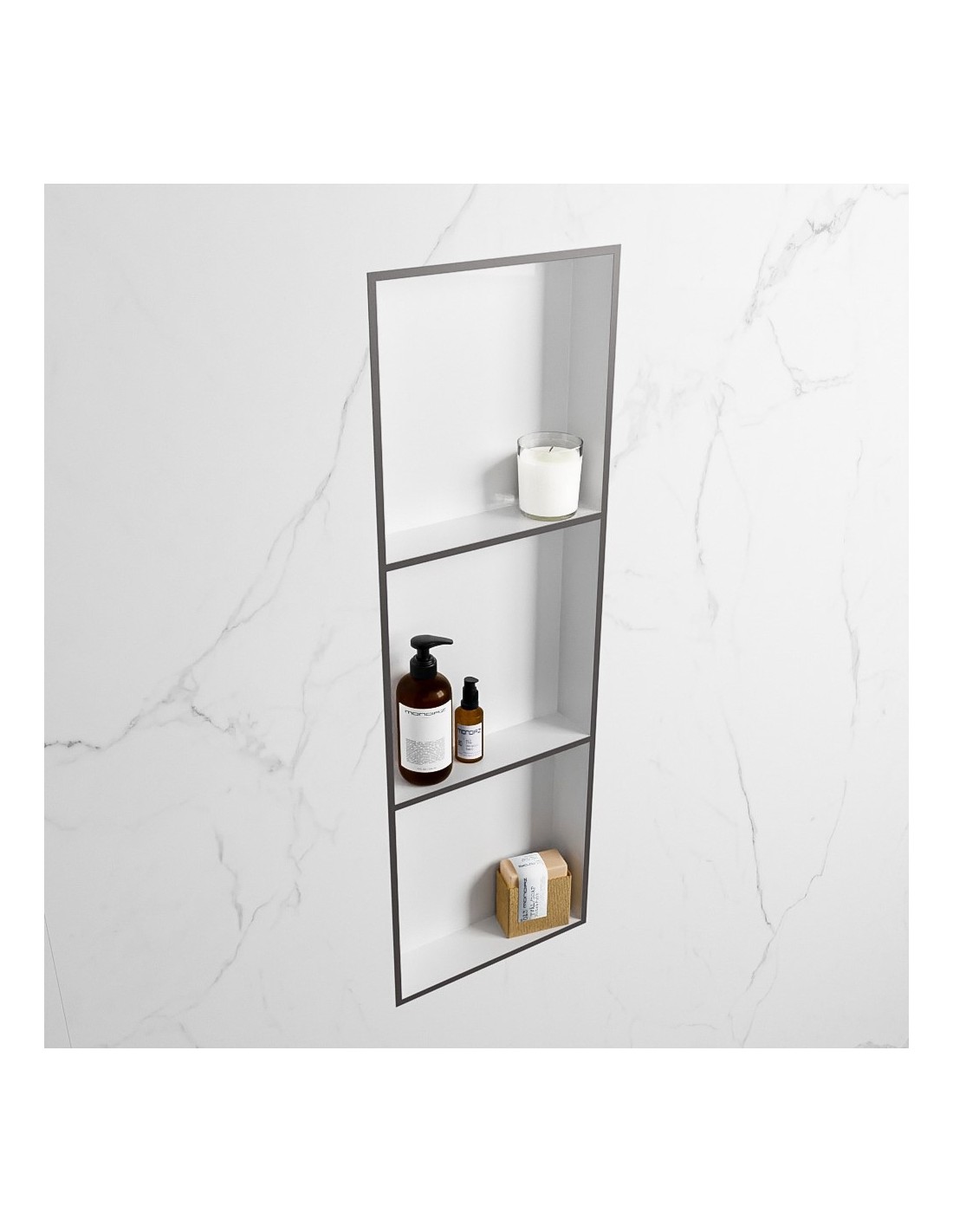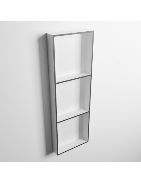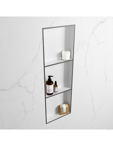 EASY hylde til badeværelset, udført i et moderne og stilrent design i det solide materiale "Solid Surface", der ikke alene giver badeværelset et stilrent design, men samtidig er lækkert at røre ved. Hylden kan enten monteres direkte på væggen, eller indbygges. Hylden måler 89,5 x 29,5 cm i højde og bredde (ydermål).