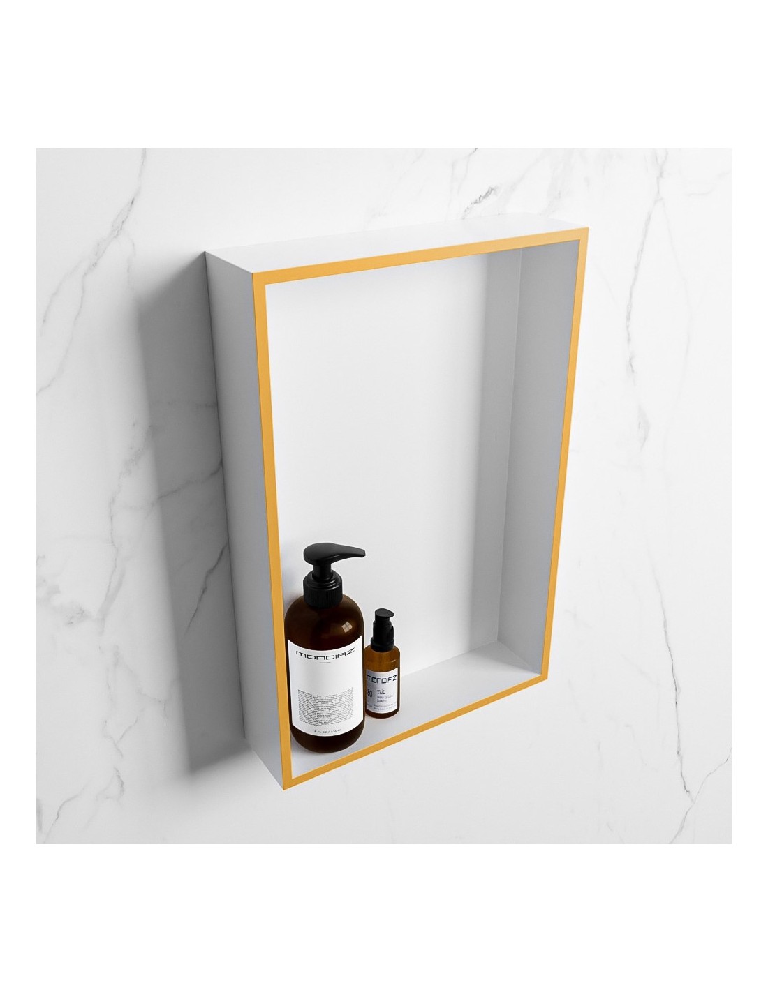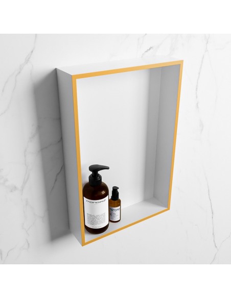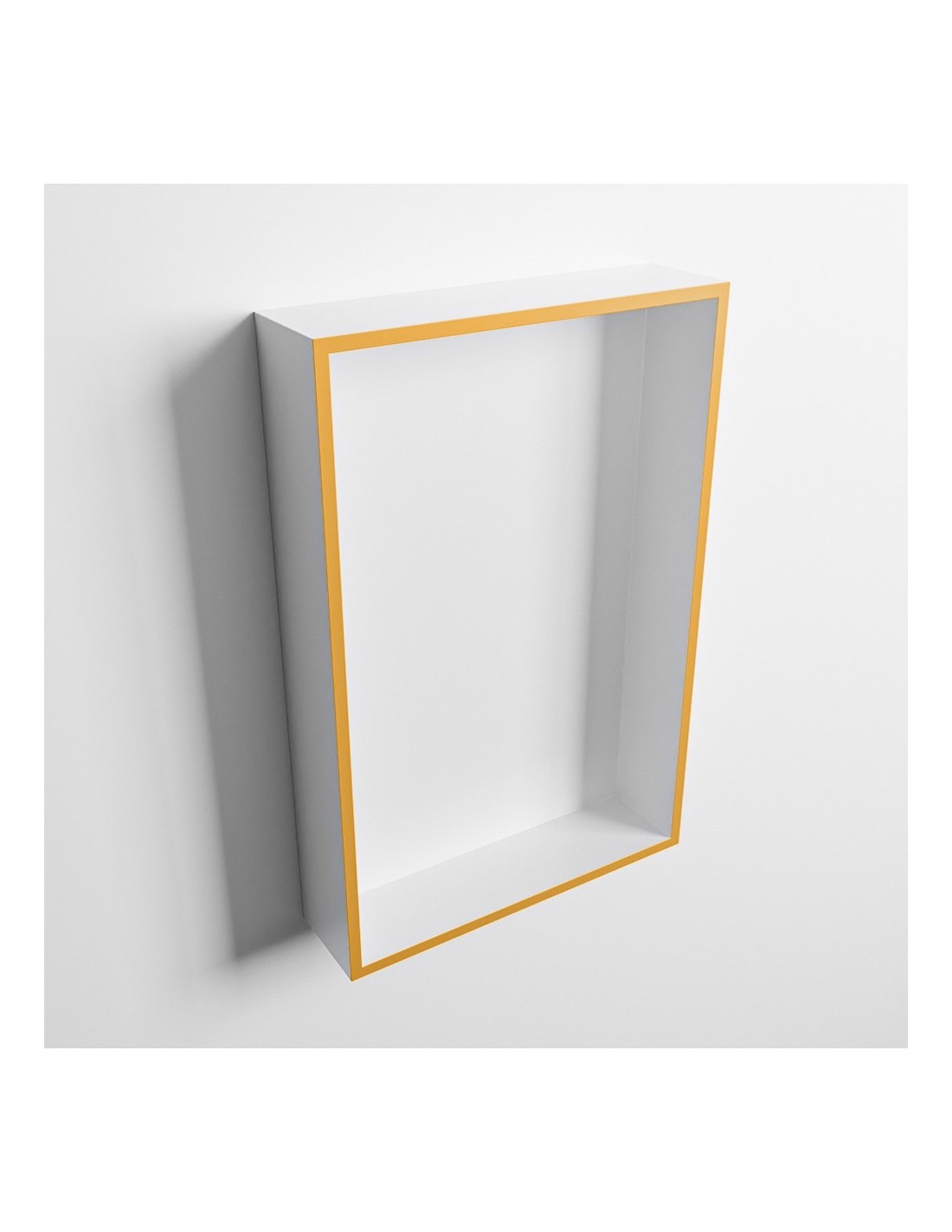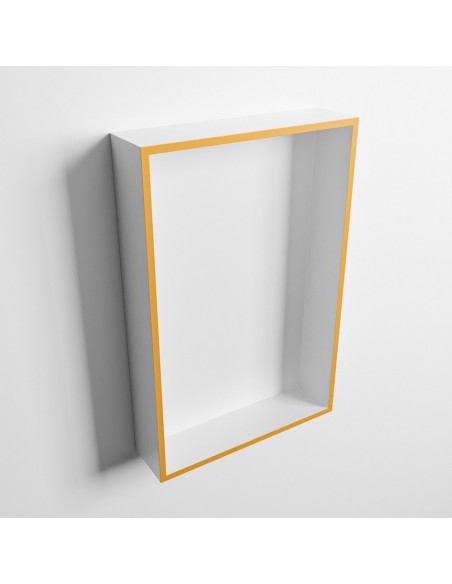 EASY hylde til badeværelset, udført i et moderne og stilrent design i det solide materiale "Solid Surface", der ikke alene giver badeværelset et stilrent design, men samtidig er lækkert at røre ved. Hylden kan enten monteres direkte på væggen, eller indbygges. Hylden måler 44,5 x 29,5 cm i højde og bredde (ydermål).