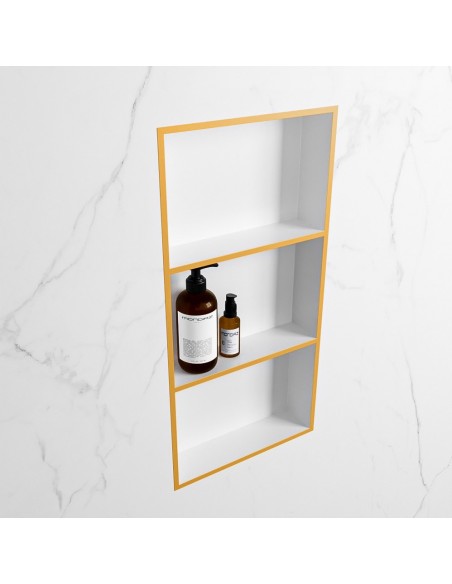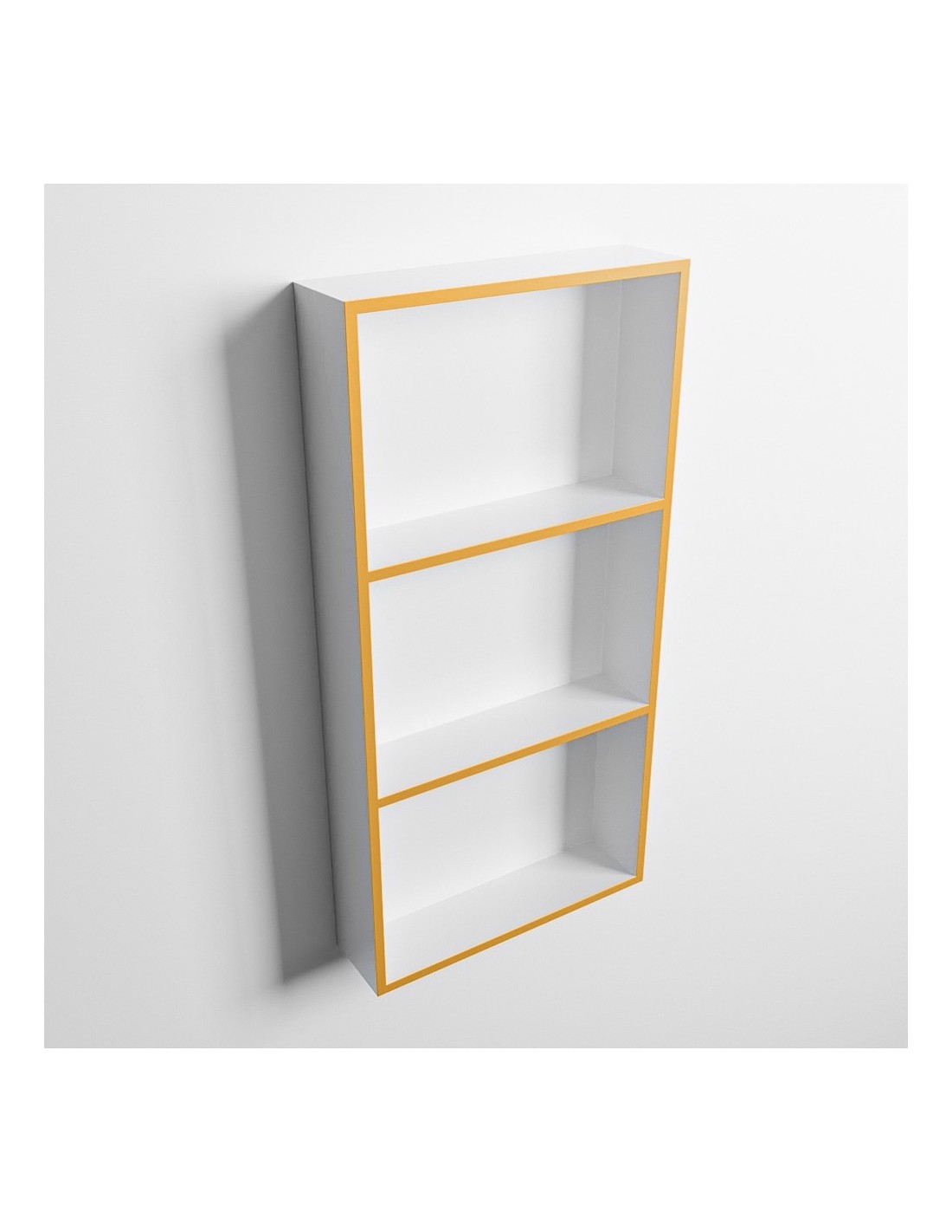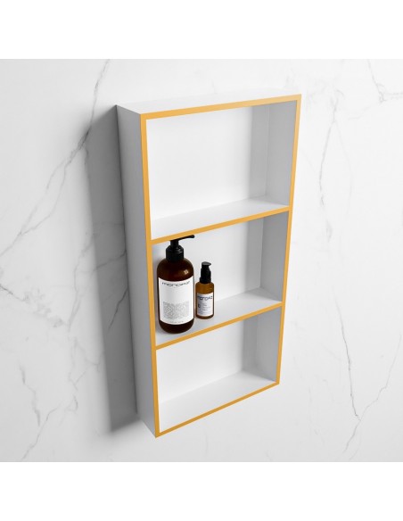 EASY hylde til badeværelset, udført i et moderne og stilrent design i det solide materiale "Solid Surface", der ikke alene giver badeværelset et stilrent design, men samtidig er lækkert at røre ved. Hylden kan enten monteres direkte på væggen, eller indbygges. Hylden måler 59,5 x 29,5 cm i højde og bredde (ydermål).