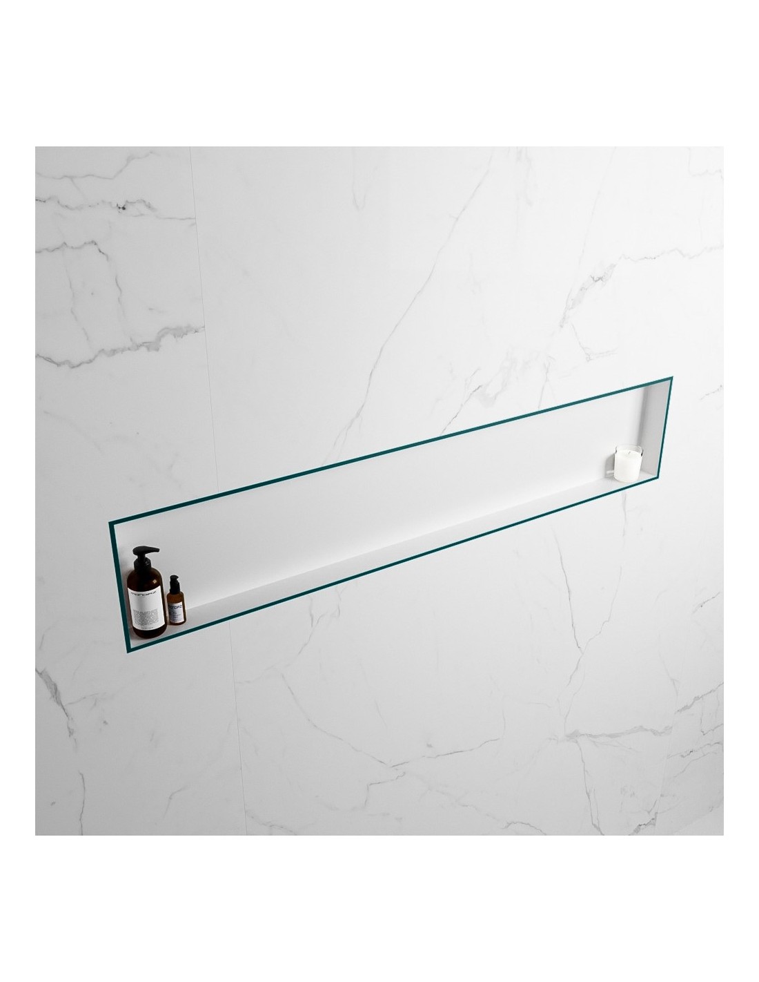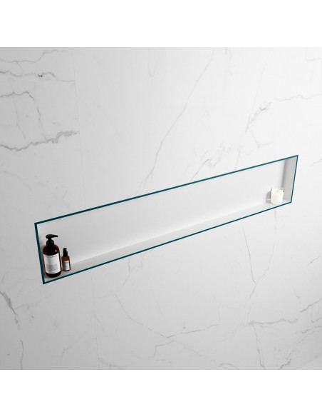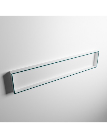 EASY hylde til badeværelset, udført i et moderne og stilrent design i det solide materiale "Solid Surface", der ikke alene giver badeværelset et stilrent design, men samtidig er lækkert at røre ved. Hylden kan enten monteres direkte på væggen, eller indbygges. Hylden måler 149,5 x 29,5 cm i højde og bredde (ydermål).