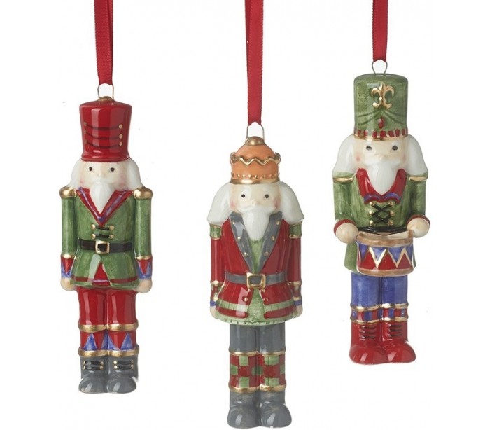 Juleophæng i et design af en nøddeknækker, fremstillet i malet polyresin. Ophænget måler 10,5 x 4,4 cm i højde og bredde. Ophængene sælges assorteret (1 stk.).