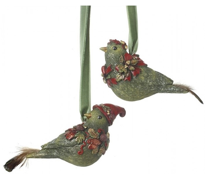 Juleophæng i et design af en grønmalet fugl i polyresin. Ophænget måler 8,8 cm i højden og sælges assorteret (1 stk.).
