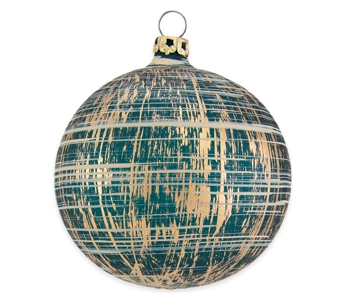 Julekugle udført i et dekorativt design, fremstillet i mat slidt petroliumsblå mundblæst glas. Glaskuglen måler 8 cm i diameter.