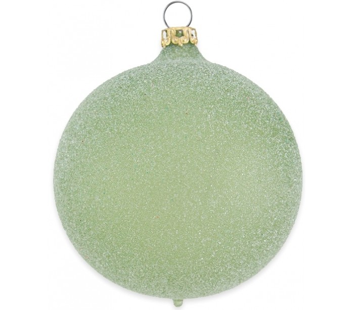 Julekugle udført i et dekorativt design, fremstillet i satineret olivengrøn mundblæst glas. Glaskuglen måler 8 cm i diameter.
