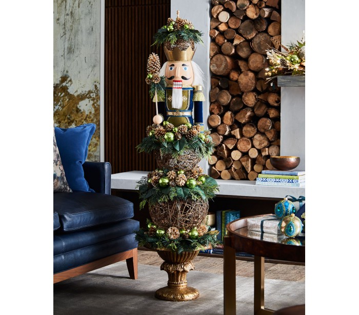 Luksuriøs nøddeknækker soldat fremstillet i naturfarvede materialer, rattan og træ, med velour i blå. Figuren måler 160 cm i højden og kommer med mange smukke detaljer. Tidligere model fra et amerikansk stormagasin, der ikke sender ud af USA længere. Formentlig den eneste i Danmark.