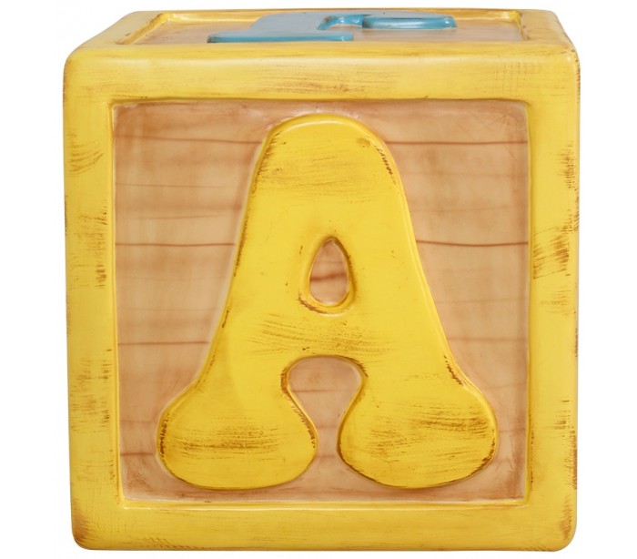 Legetøjsklods udført i et design af antik gul og fremstillet i solidt fiberglas. Klodsen måler 55 cm i højden og 55 x 55 cm i bredde og dybde.