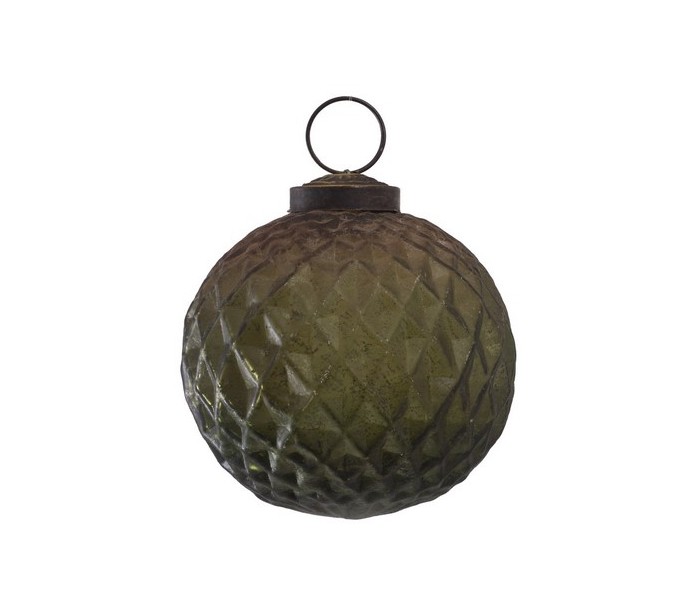 Julekugle i et rustikt design, fremstillet i glas og med en flot effekt af grøn og kobber. Glaskuglen måler 7 cm i diameter.