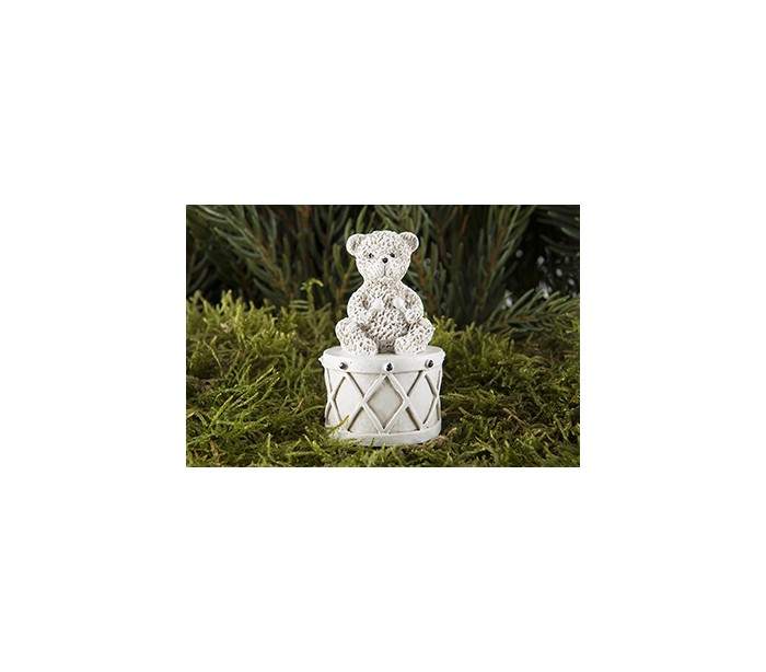 Bjørn med tromme i et smukt udført design, fremstillet af cremefarvet polyresin. Figuren kommer med pind, således den er særligt anvendeligt i adventskrans eller anden juledekoration. Figuren måler 6 cm i højden.