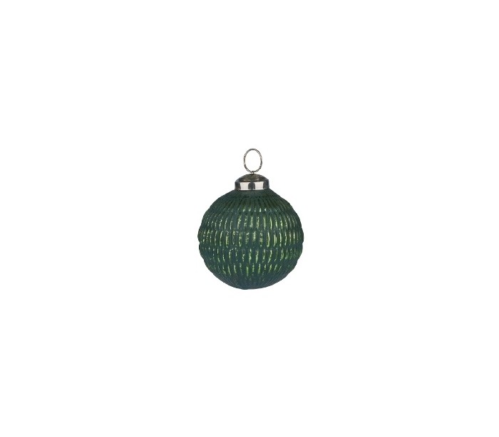 Julekugle udført i et design af mørkegrøn og med diameter på 7,5 cm. Kuglen er udført i glas, og kommer fra Homeart by Bahne.