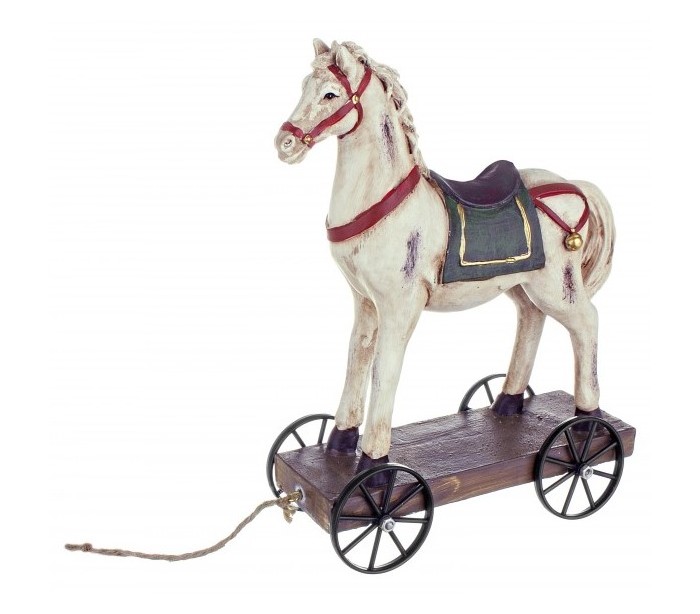 Trækhest med snor, udført i et smukt design og fremstillet i polyresin. Figuren måler 18,5 x 14,5 x 5 cm.