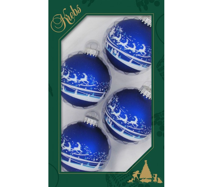Sæt med 4 julekugler fra tyske Krebs, udført i et smukt og dekorativt design af blåt glas med motiv. Kuglerne måler 7 cm i diameter.