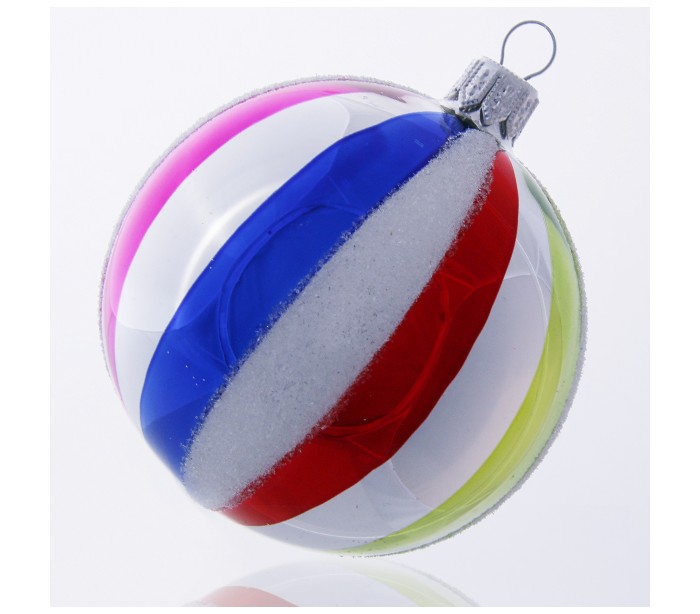 Julekugle udført i et smukt og dekorativt design af mundblæst multifarvet glas, og med diameter på 8 cm.