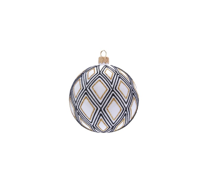 Julekugle udført i et smukt og dekorativt design af mundblæst hvidt og sortmalet glas, og med diameter på 8 cm.