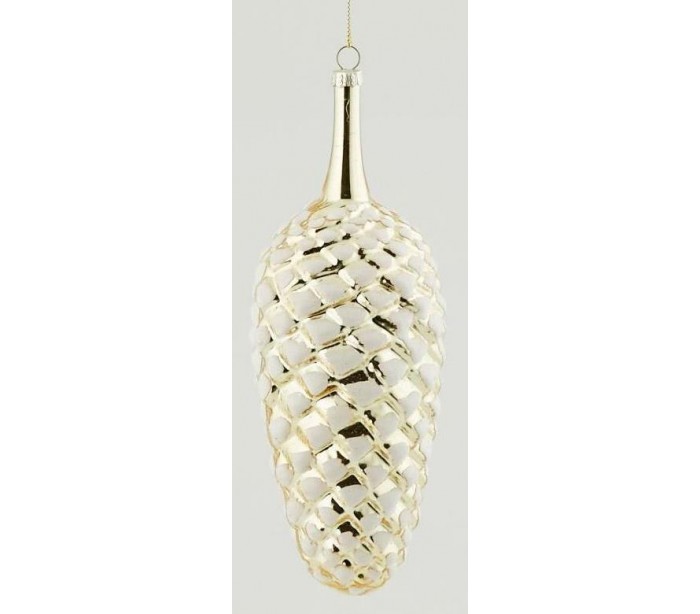 Julekogle udført i et smukt og dekorativt design af guldfarvet glas. Koglen måler 20 cm i højden.
