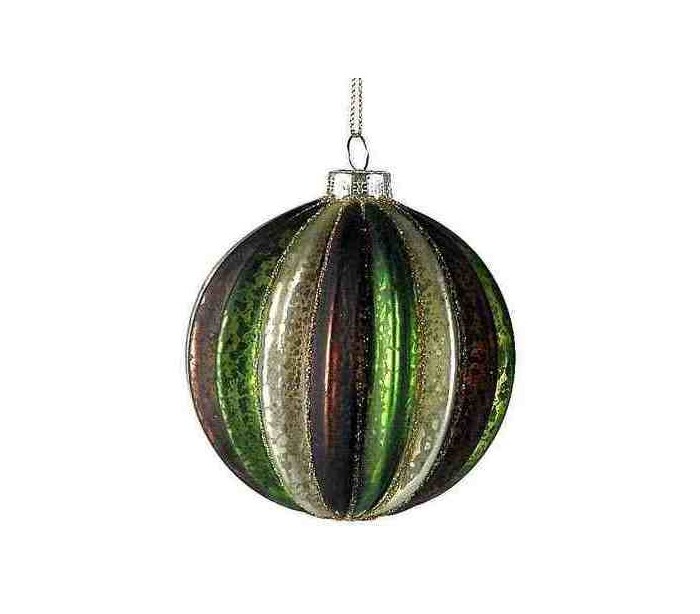 Julekugle udført i et smukt og dekorativt design af brunt og grønt glas. Kuglen måler 8 cm i diameter.
