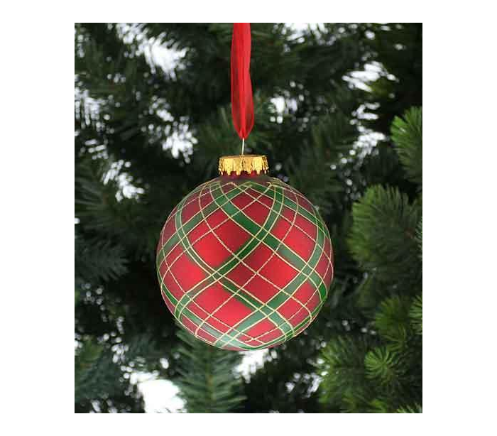Julekugle udført i et smukt design af tartanfarvet glas, med en diameter på 10 cm.