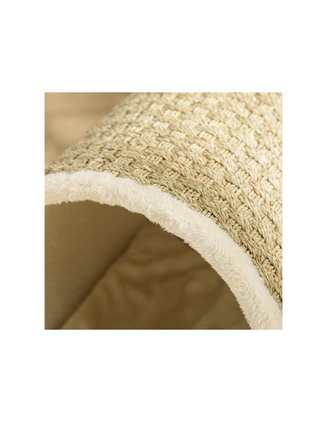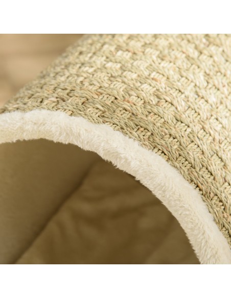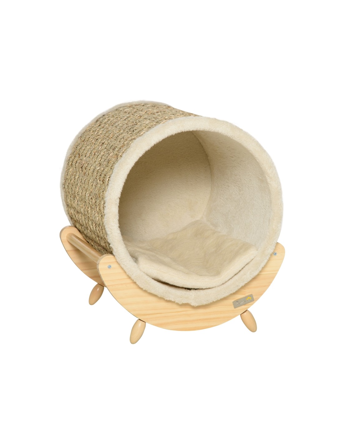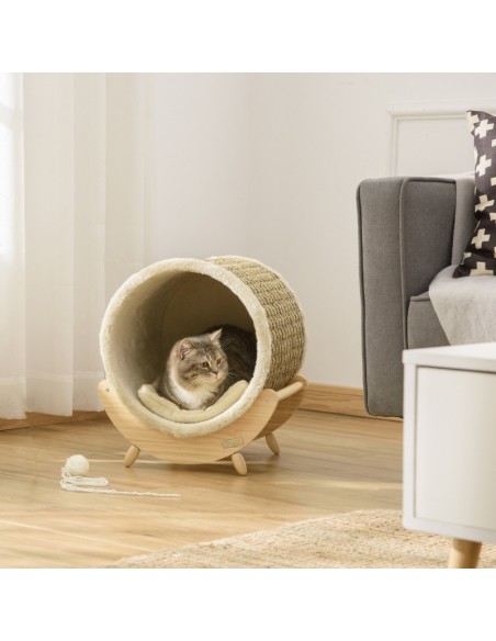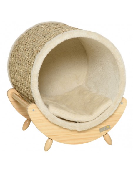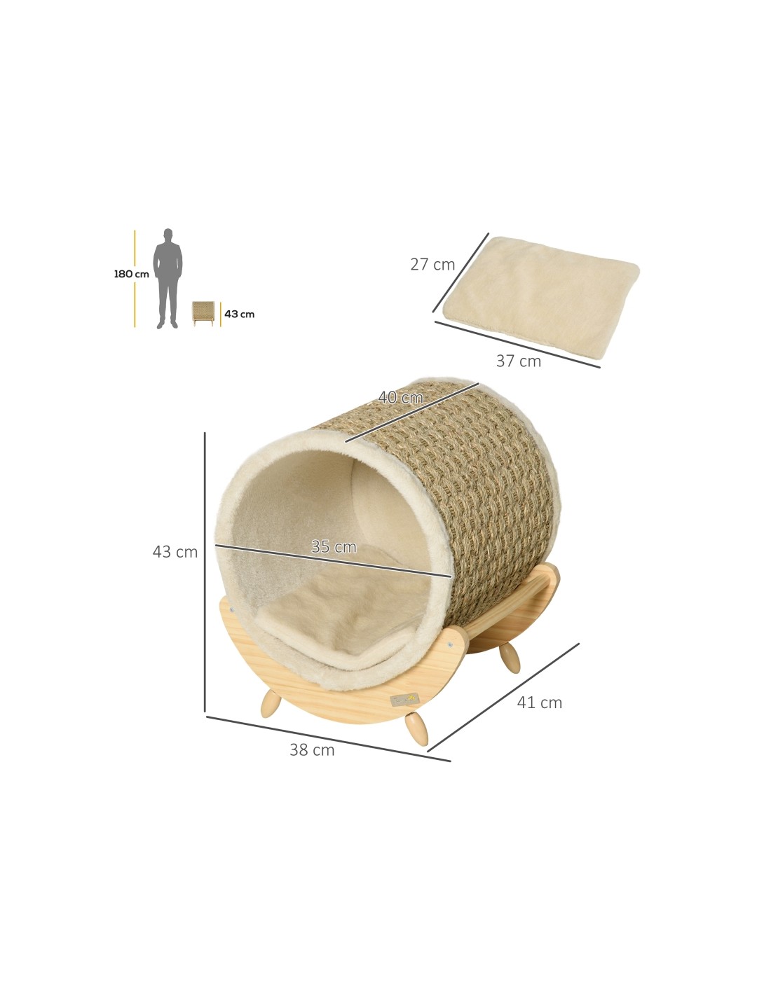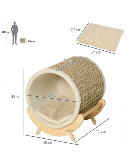 Katteseng med kradsemulighed, udført i et design af fyrretræ og polyester. Kattesengen måler 43 cm i højden og 41 x 38 cm i bredde og dybde. Vi anbefaler ikke at sengen står udendørs når der er fugt eller regnvejr.
