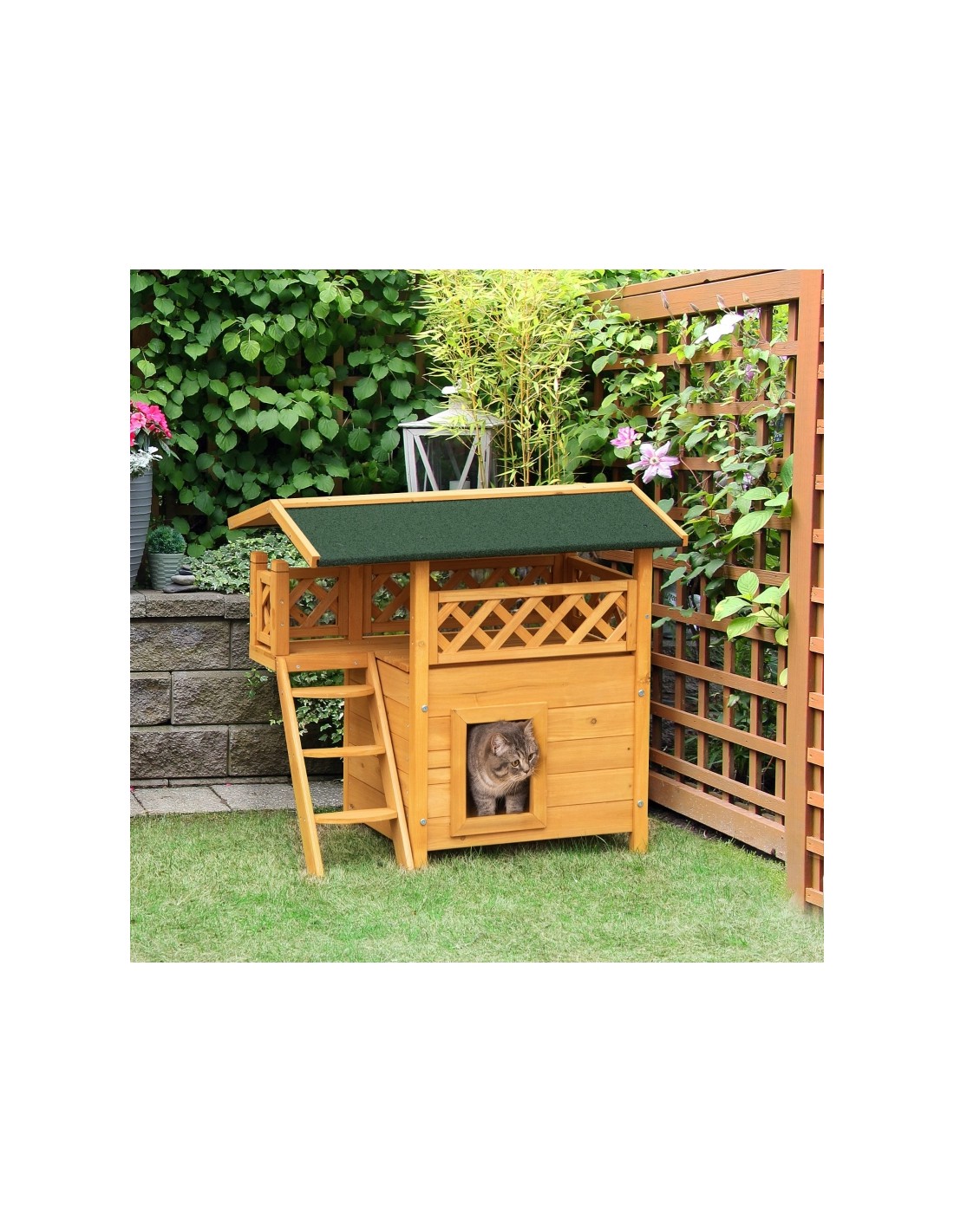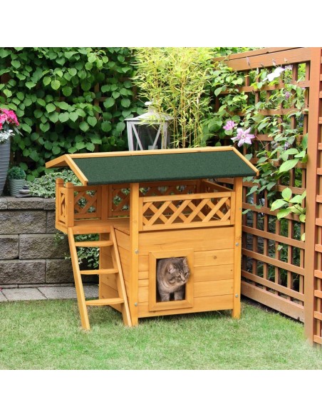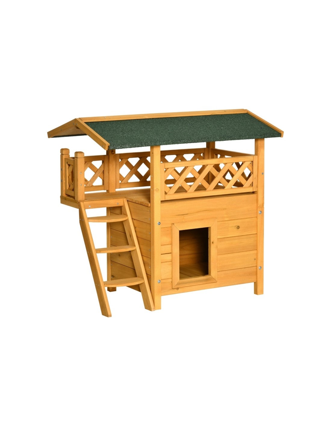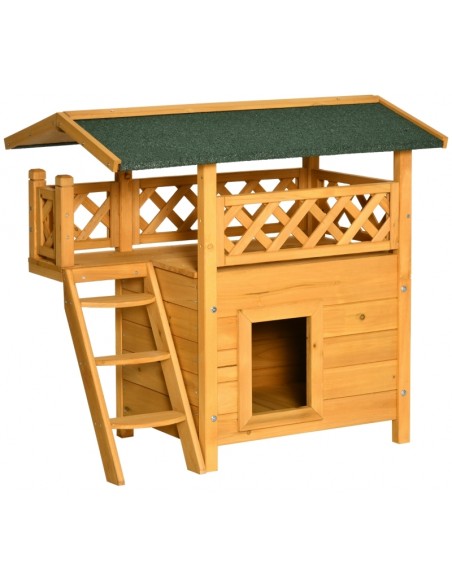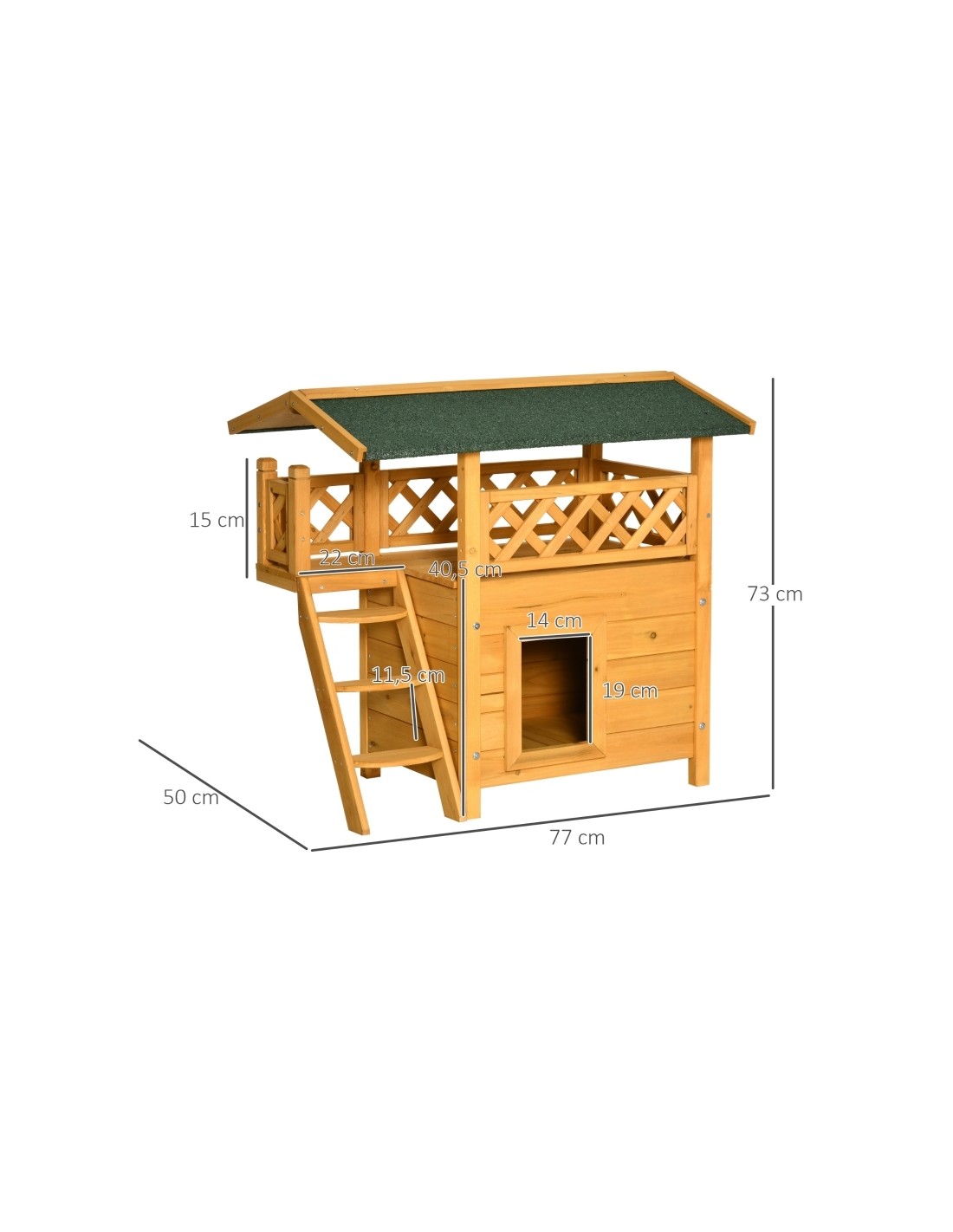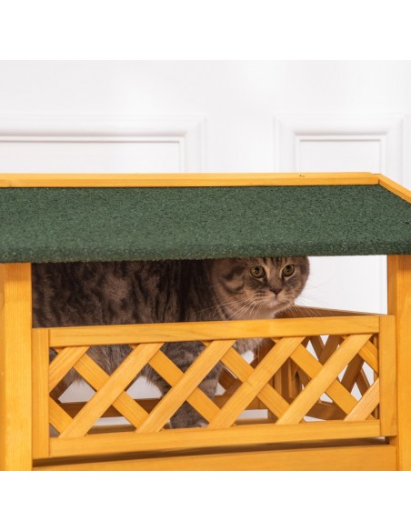 Kattehus udført i et design af fyrretræ og tagpap. Kattehuset måler 73 cm i højden og 77 x 50 cm i bredde og dybde.