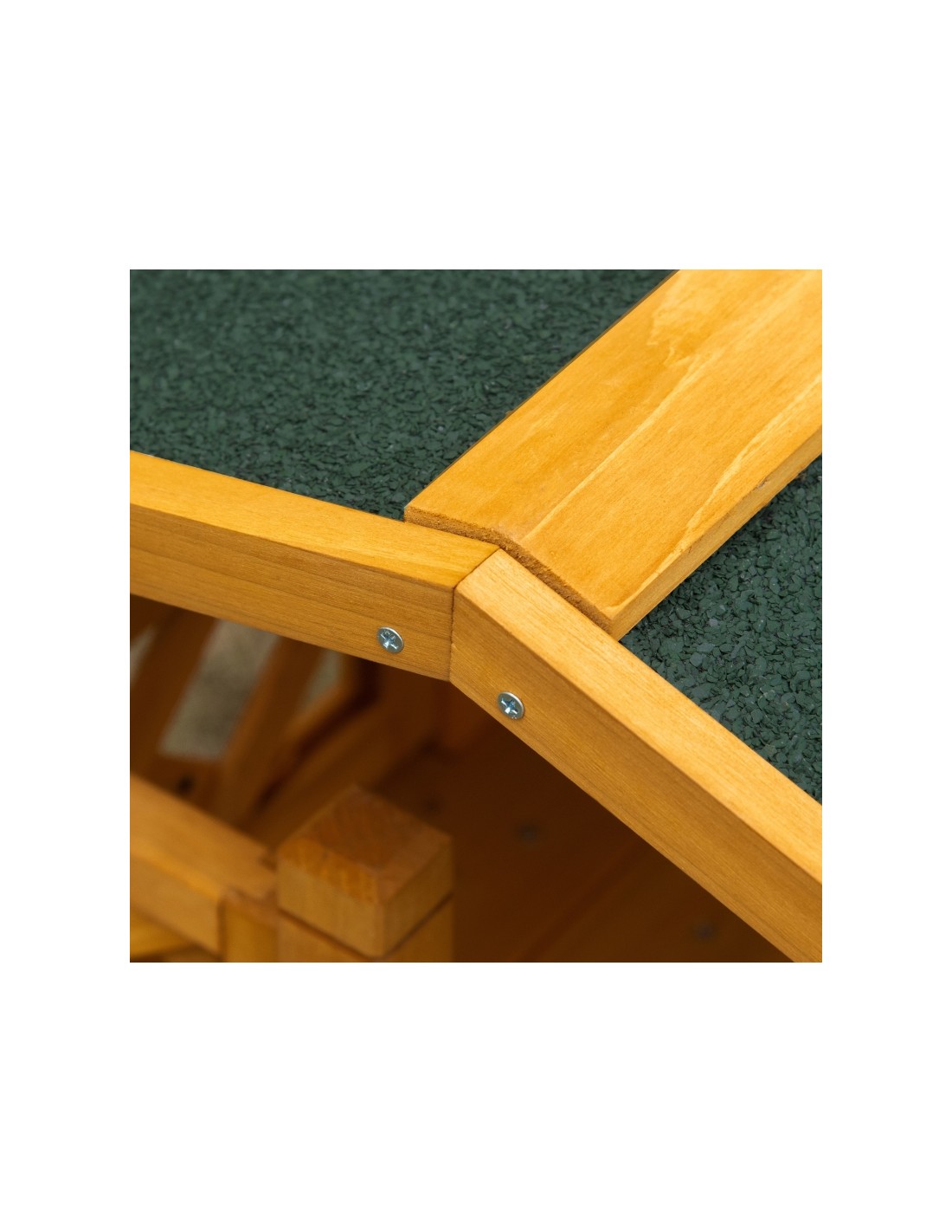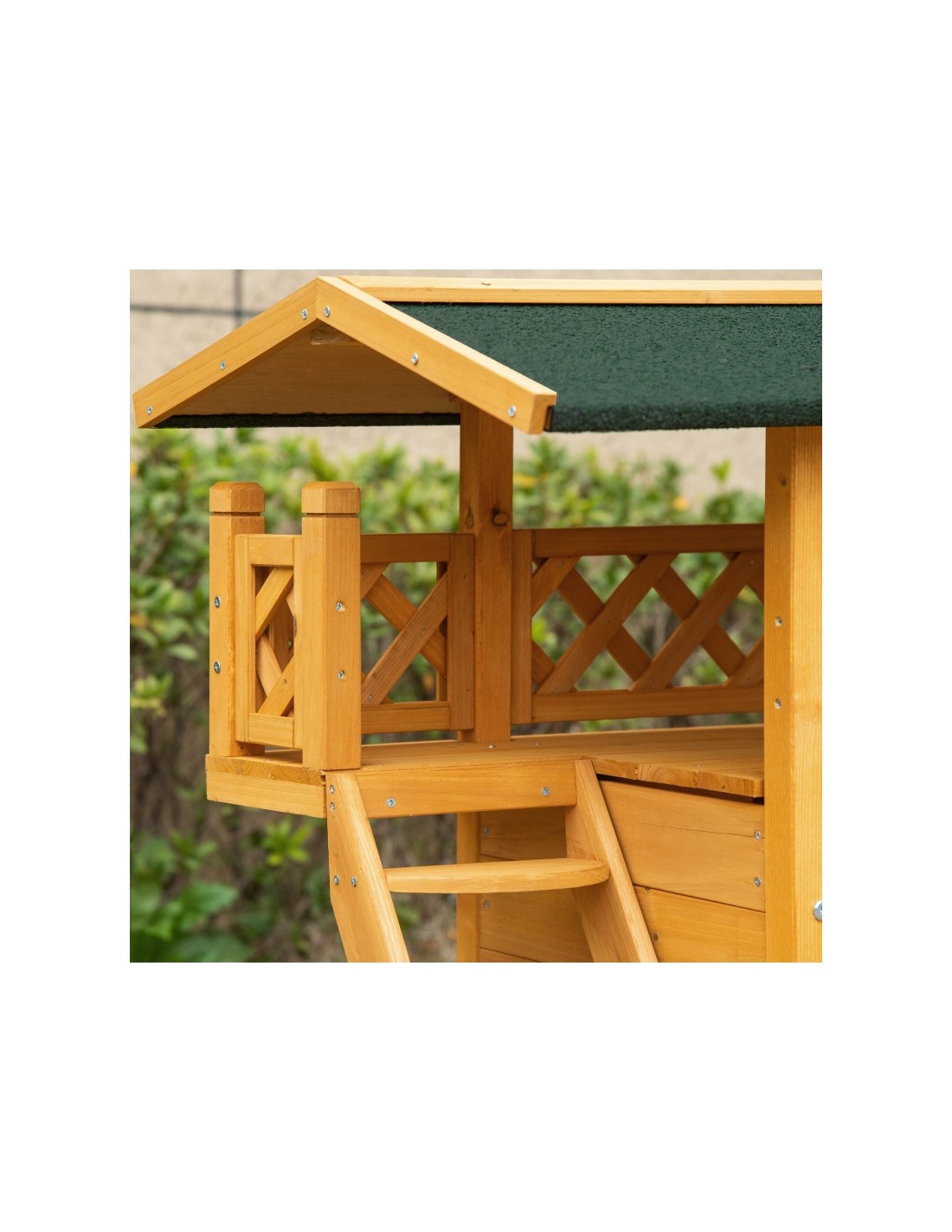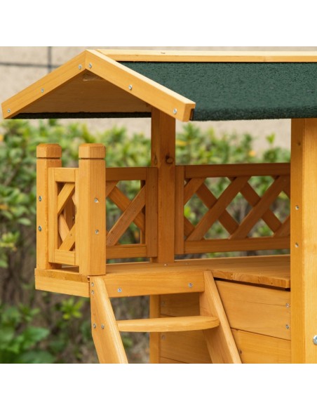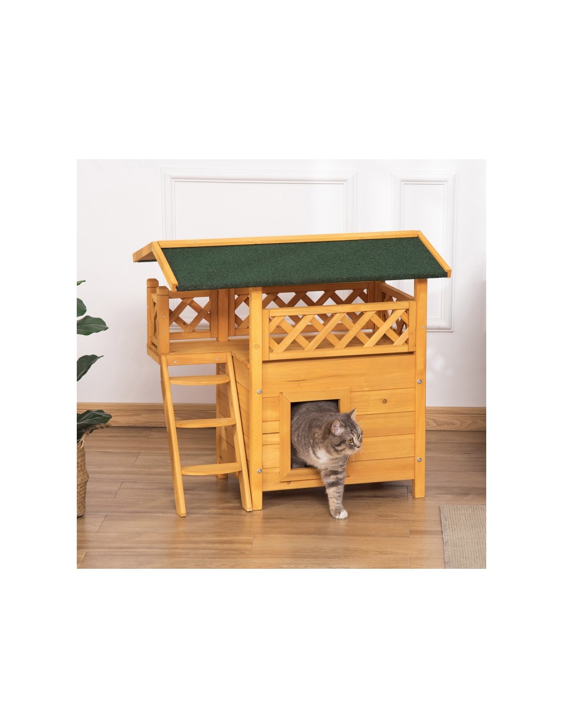 Kattehus udført i et design af fyrretræ og tagpap. Kattehuset måler 73 cm i højden og 77 x 50 cm i bredde og dybde.