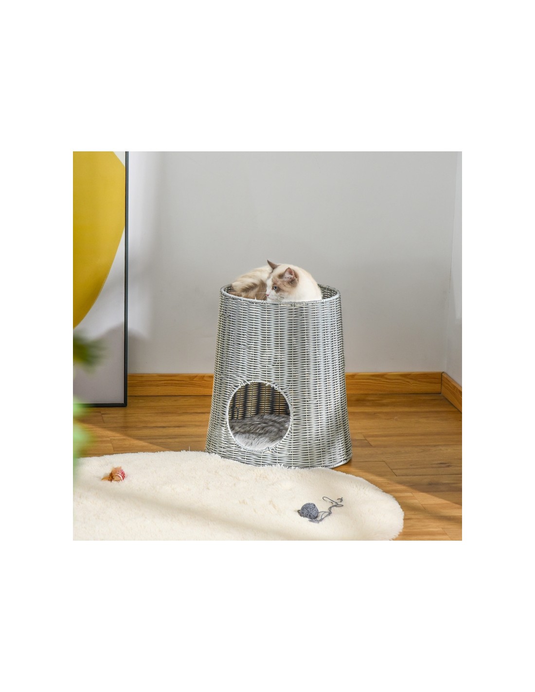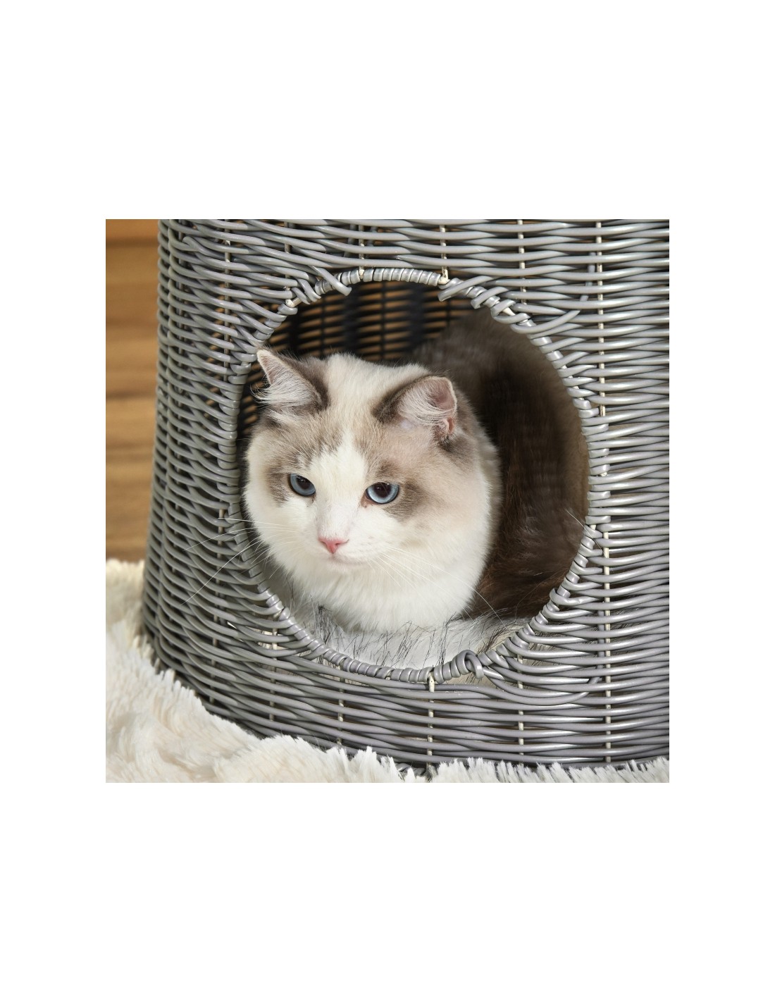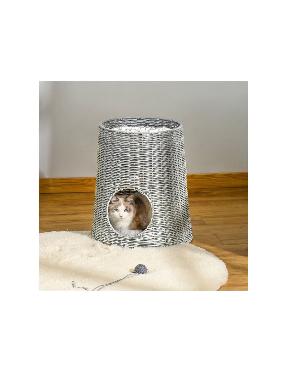 Katteseng udført i et design af polyrattan og polyester. Kattesengen måler 50 cm i højden og 45 cm i bredde og dybde. Vi anbefaler ikke at sengen står udendørs når der er fugt eller regnvejr.