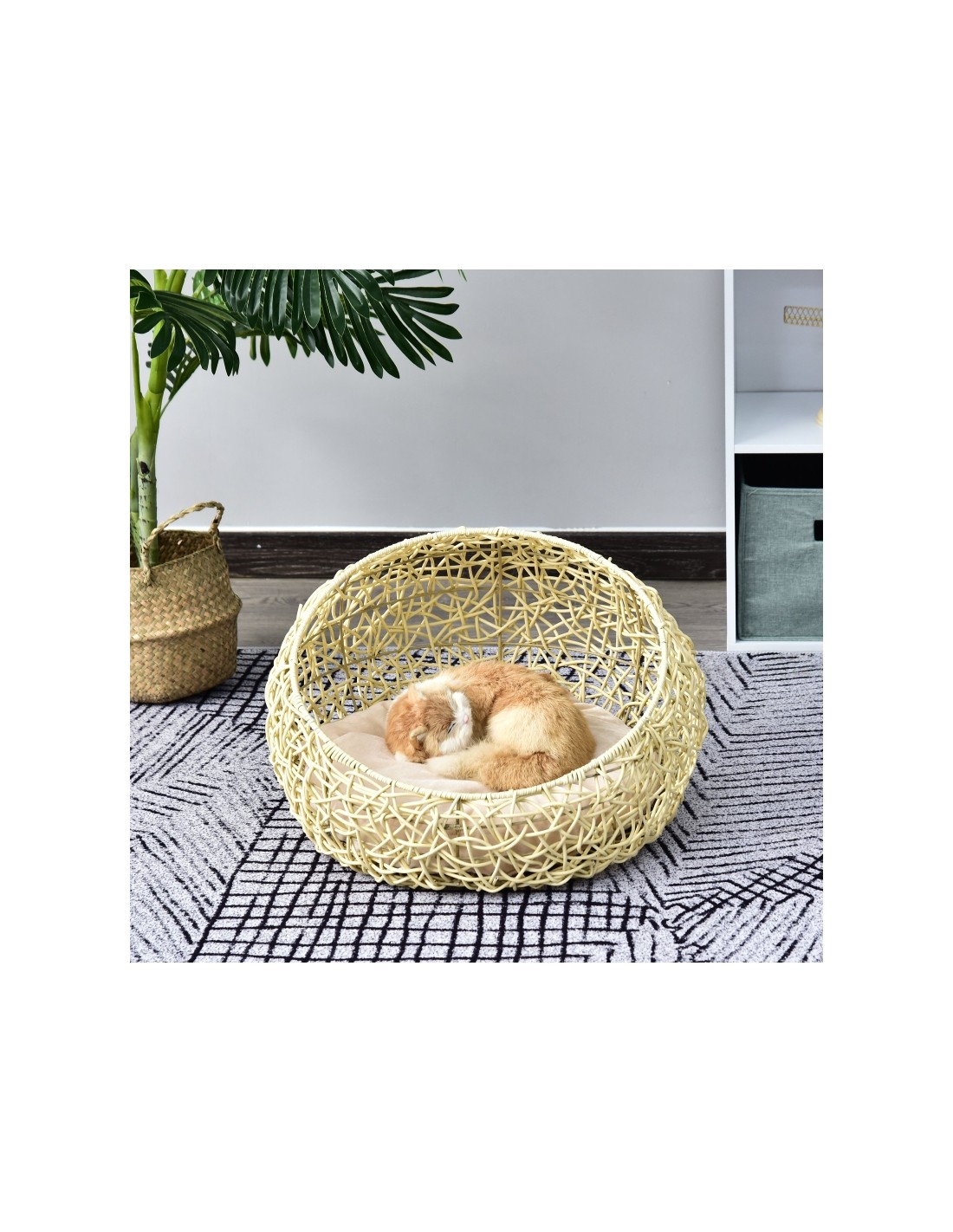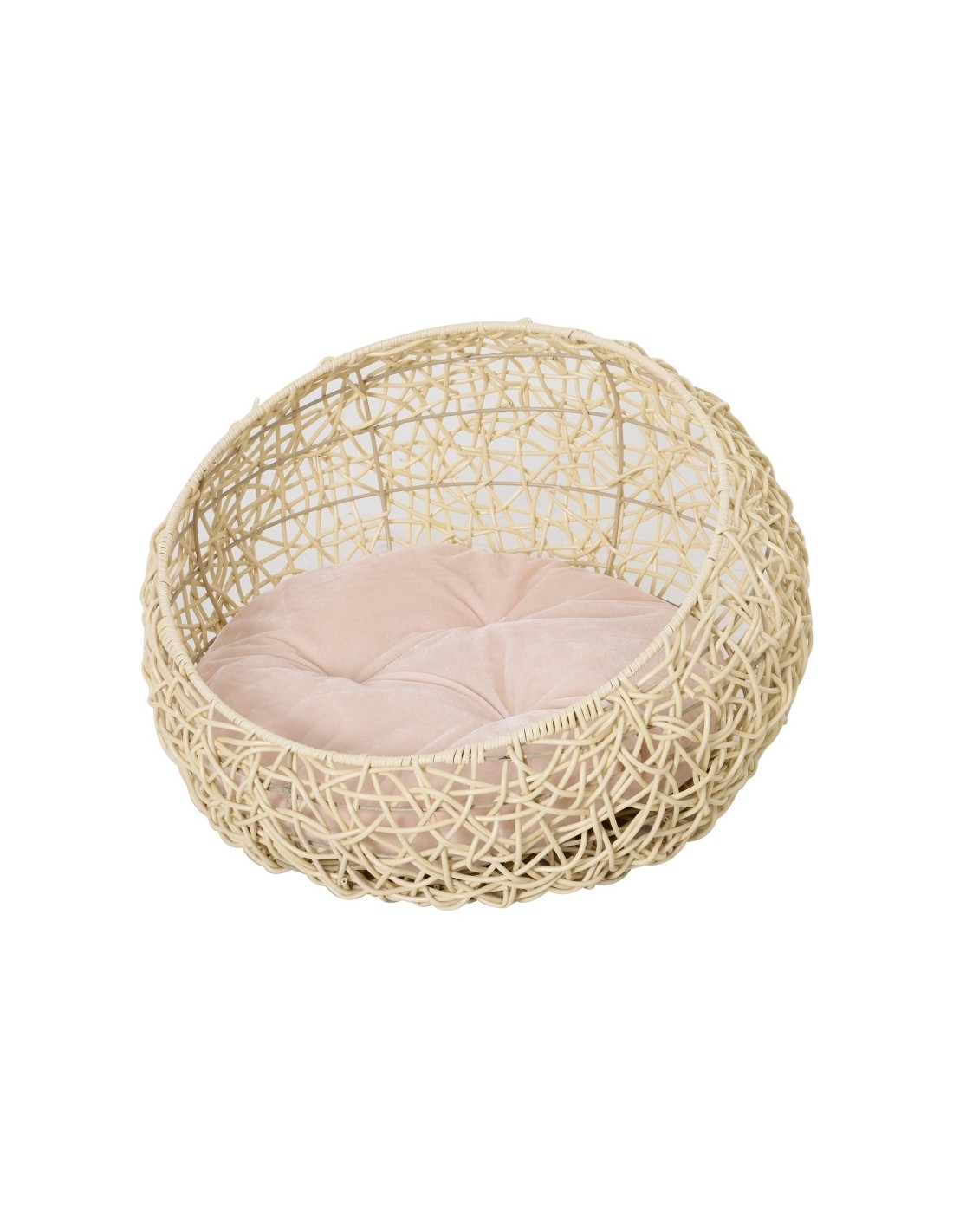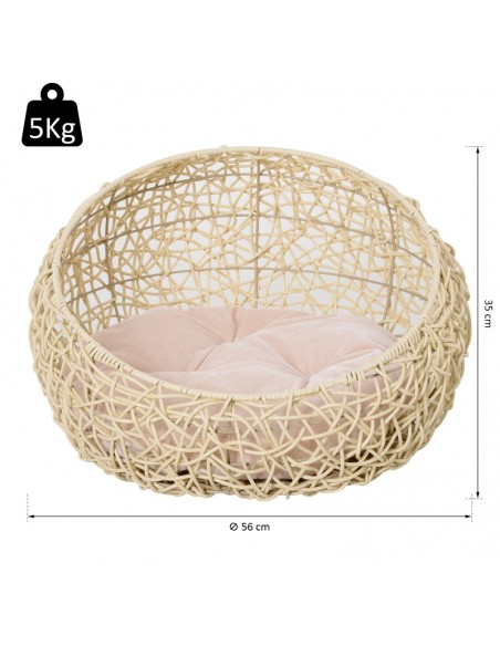Katteseng udført i et design af polyrattan og bomuld. Kattesengen måler 35 cm i højden og 56 cm i bredde og dybde. Vi anbefaler ikke at sengen står udendørs når der er fugt eller regnvejr.