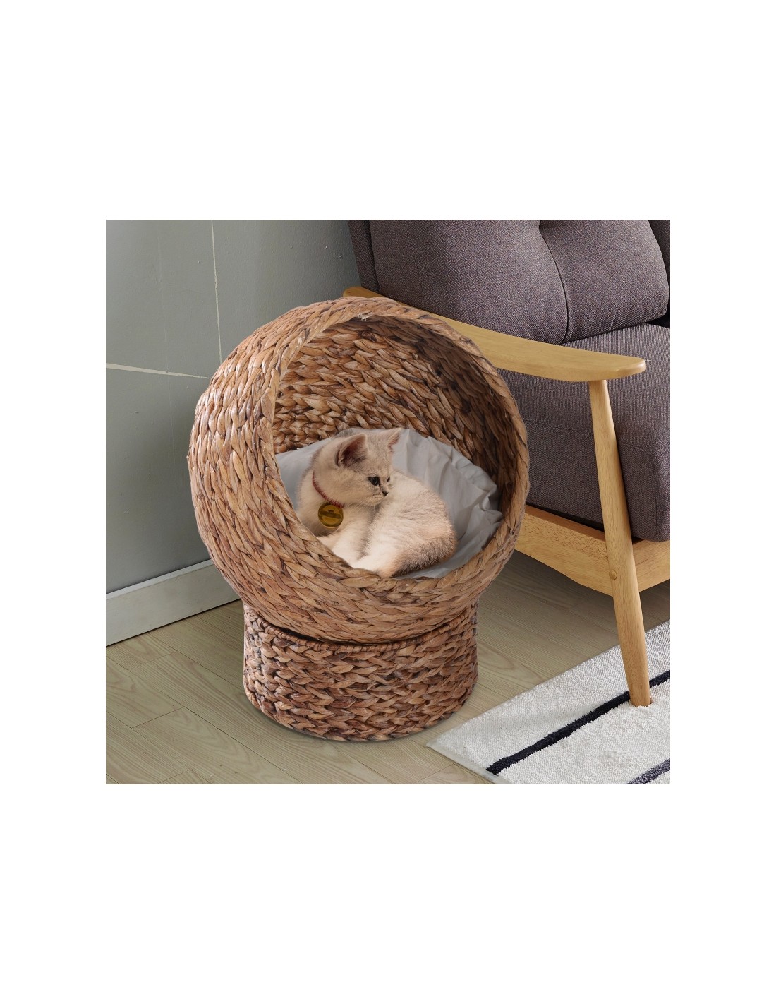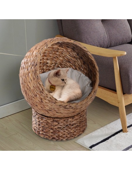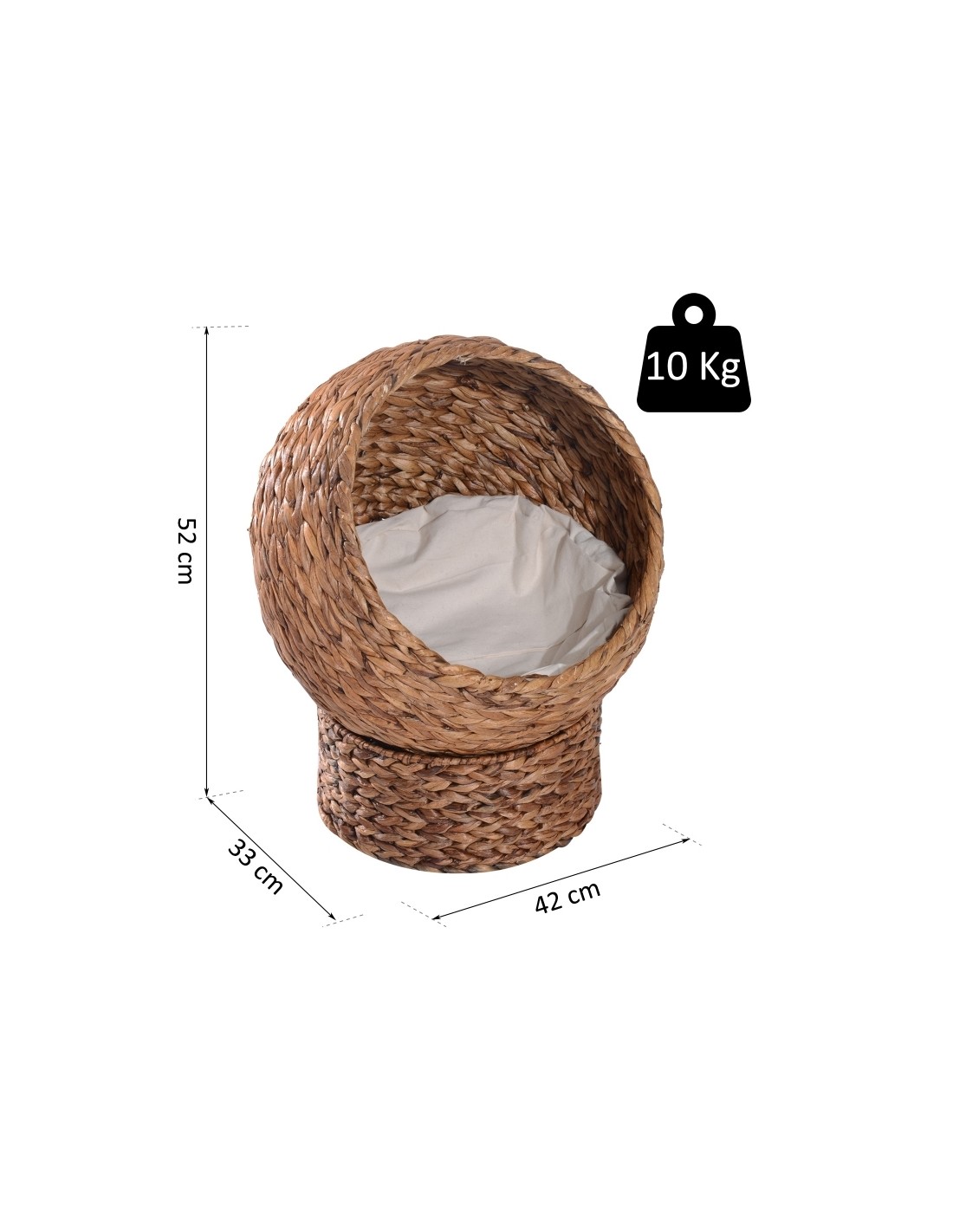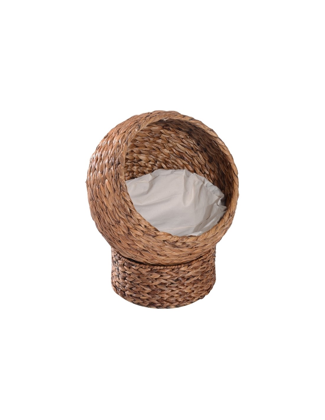 Katteseng udført i et design af stråflet og bomuld. Kattesengen måler 52 cm i højden og 42 x 33 cm i bredde og dybde. Vi anbefaler ikke at sengen står udendørs når der er fugt eller regnvejr.