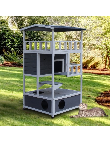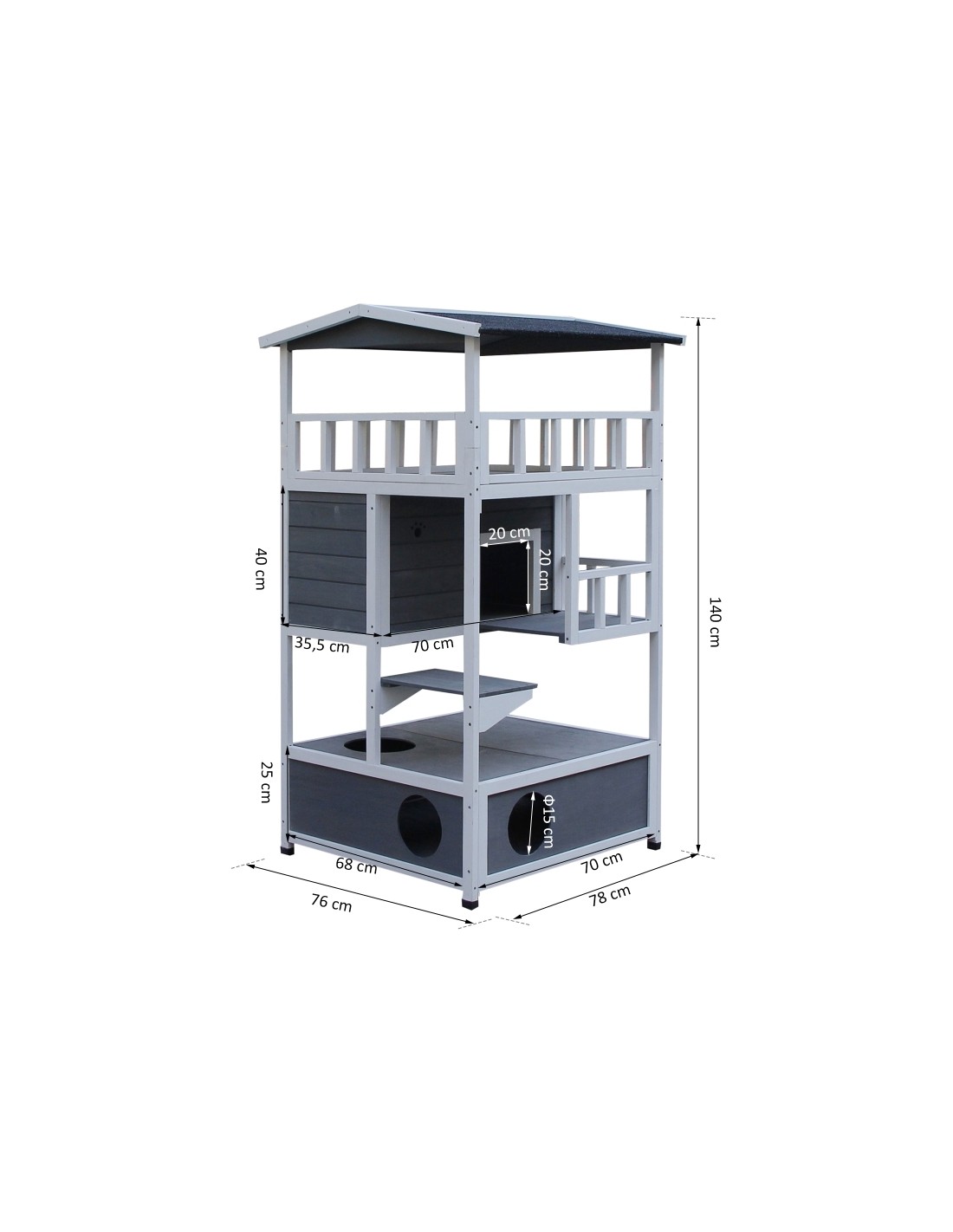 Kattehus udført i et design af fyrretræ og tagpap. Kattehuset måler 140 cm i højden og 78 x 76 cm i bredde og dybde.