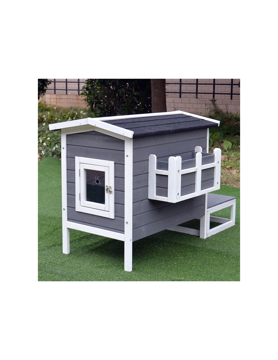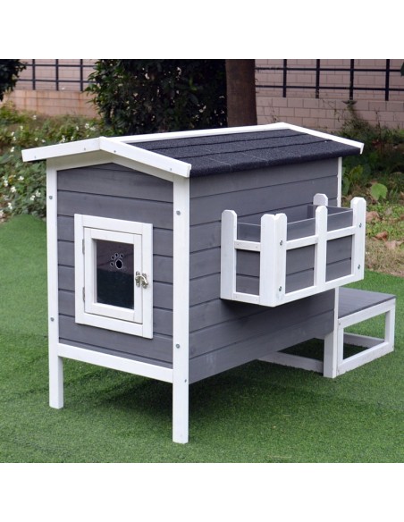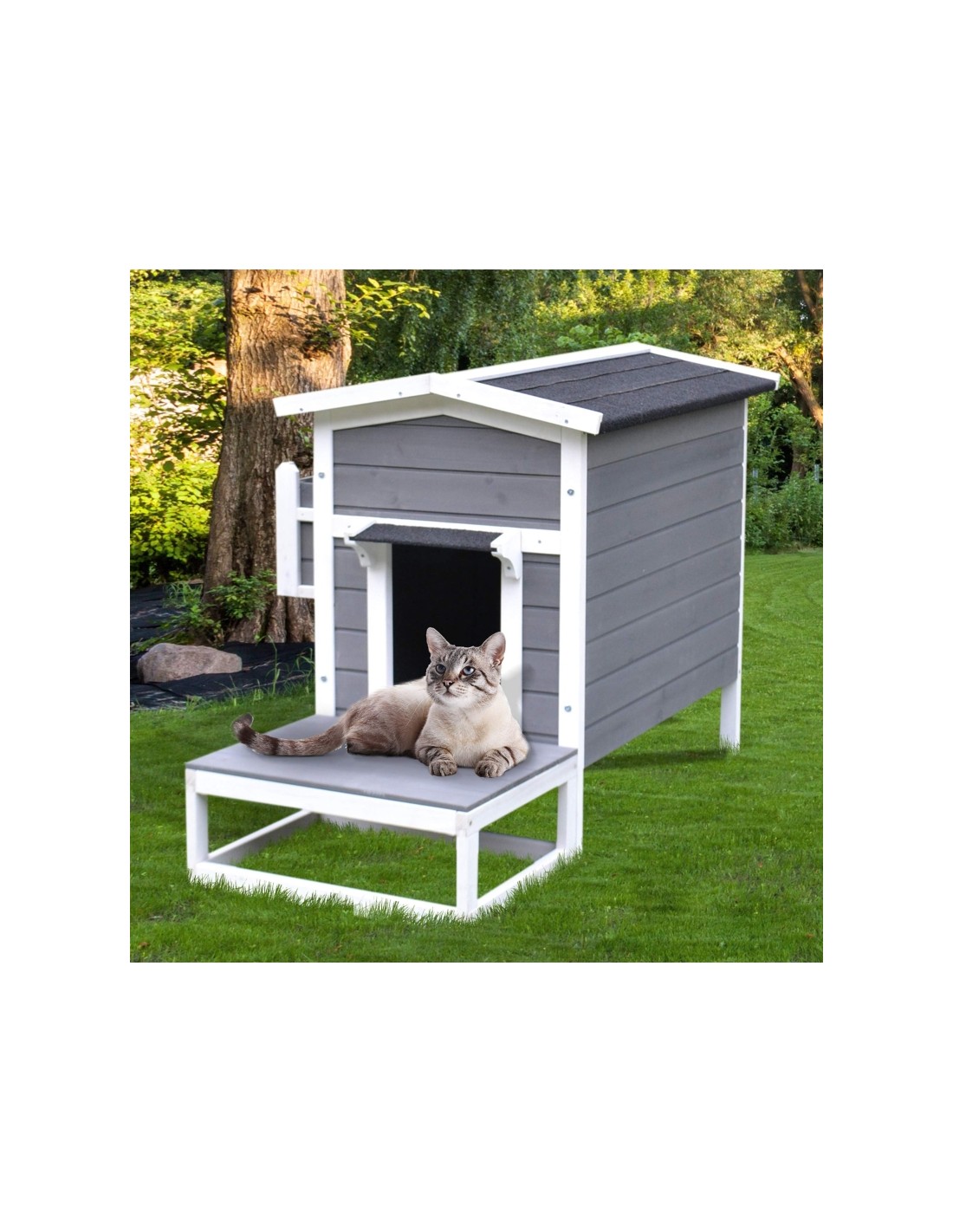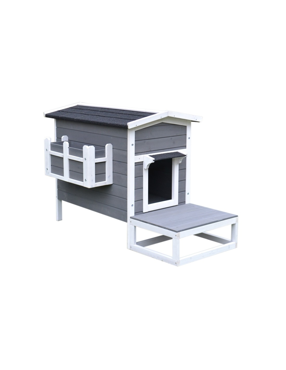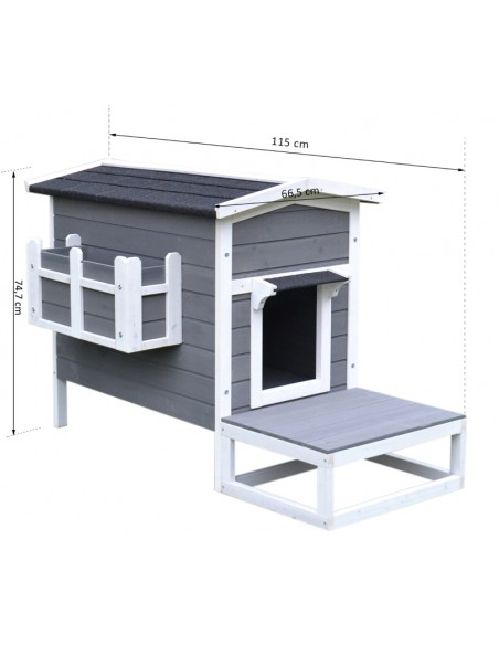 Kattehus udført i et design af fyrretræ og tagpap. Kattehuset måler 74,7 cm i højden og 115 x 66,5 cm i bredde og dybde.