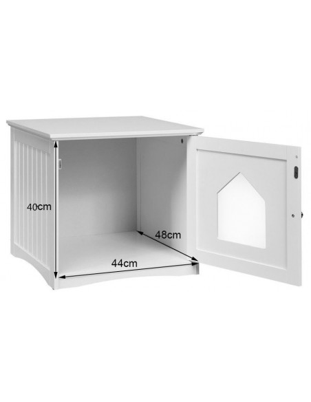 Kattehus udført i et design af træ. Kattehuset måler 47 cm i højden og 49 x 51 cm i bredde og dybde. Vi anbefaler ikke at møblet står udendørs når der er fugt eller regnvejr.