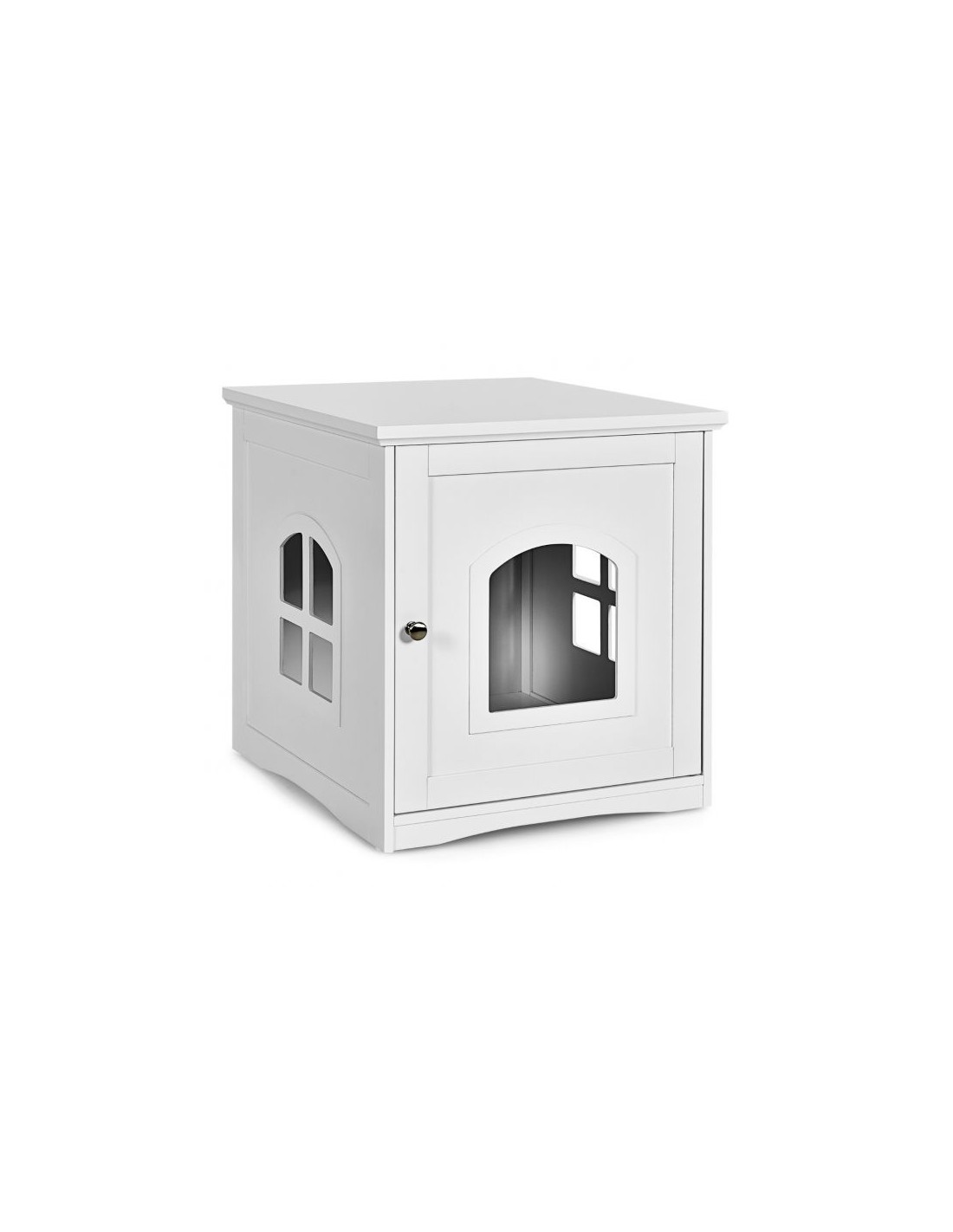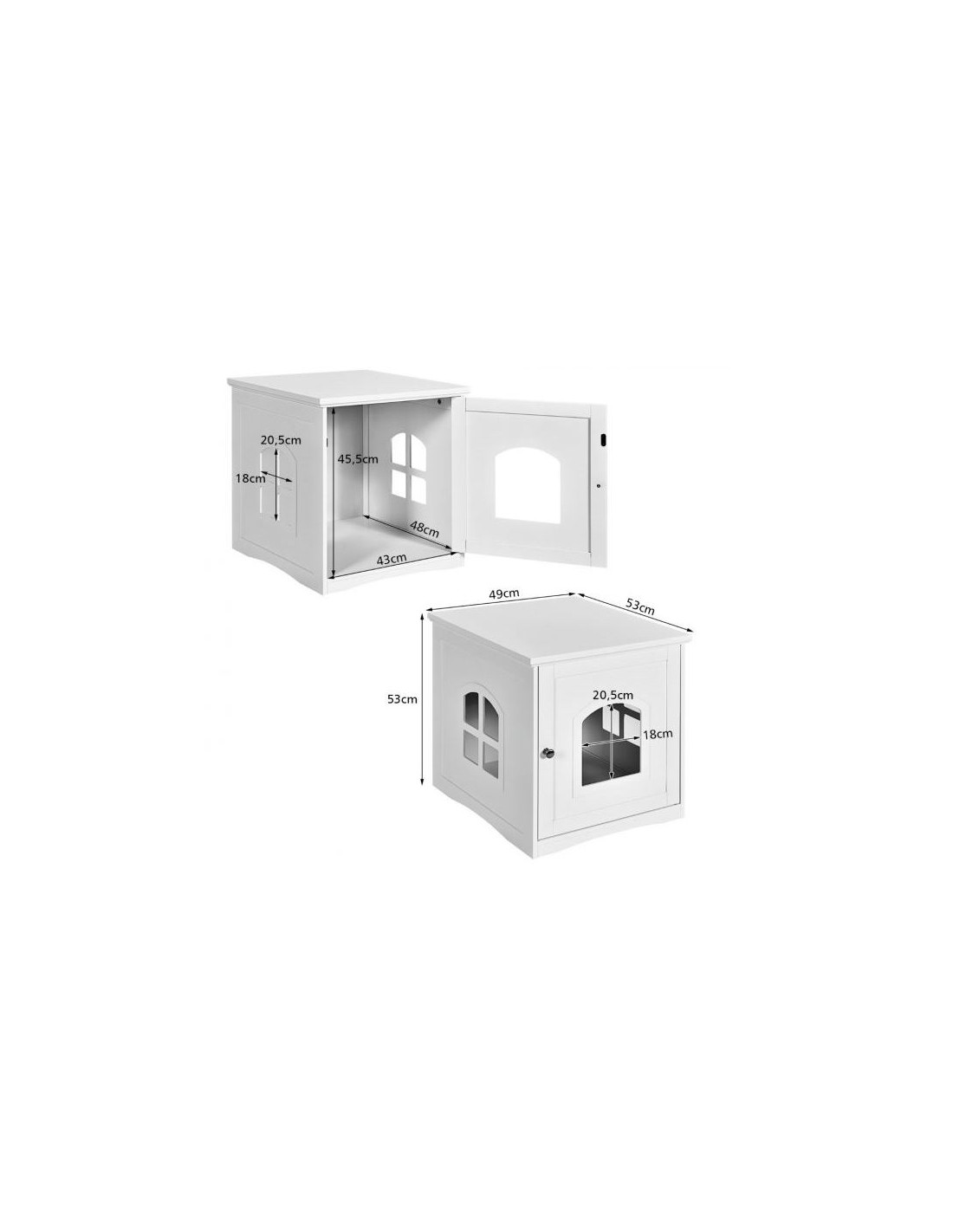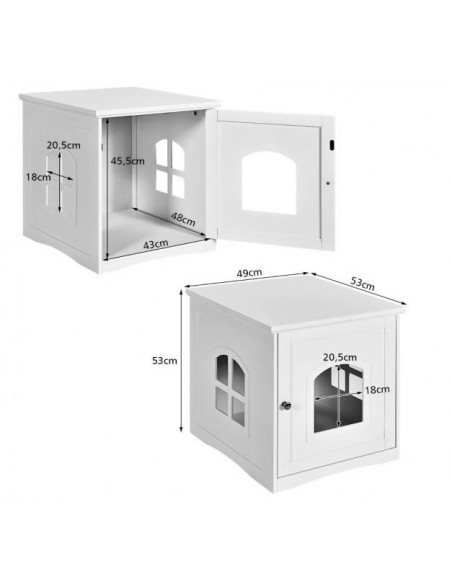 Kattehus udført i et design af træ. Kattehuset måler 53 cm i højden og 49 x 53 cm i bredde og dybde. Vi anbefaler ikke at møblet står udendørs når der er fugt eller regnvejr.