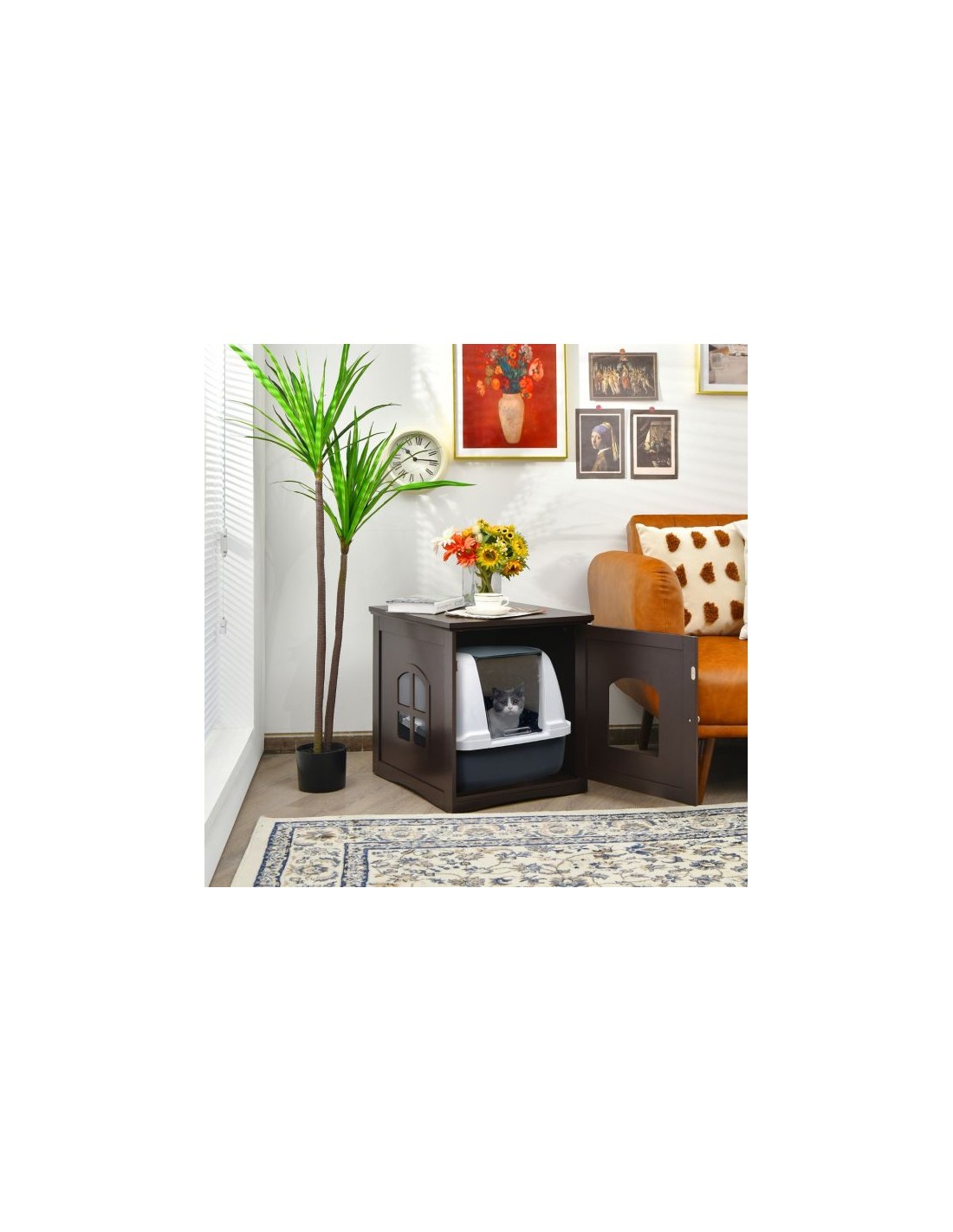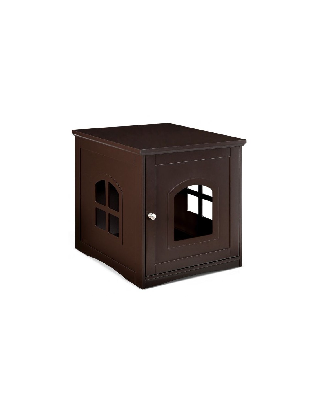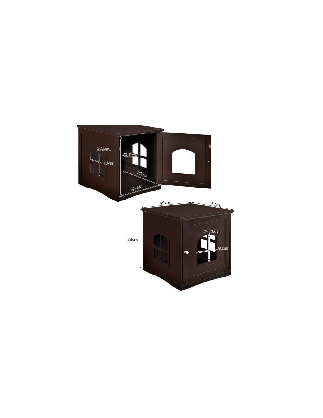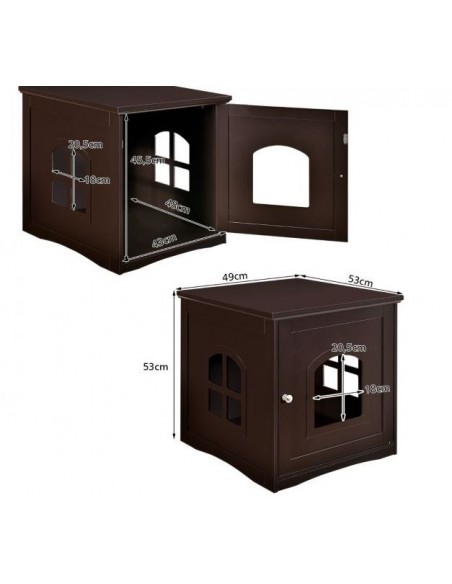Kattehus udført i et design af træ. Kattehuset måler 53 cm i højden og 49 x 53 cm i bredde og dybde. Vi anbefaler ikke at møblet står udendørs når der er fugt eller regnvejr.